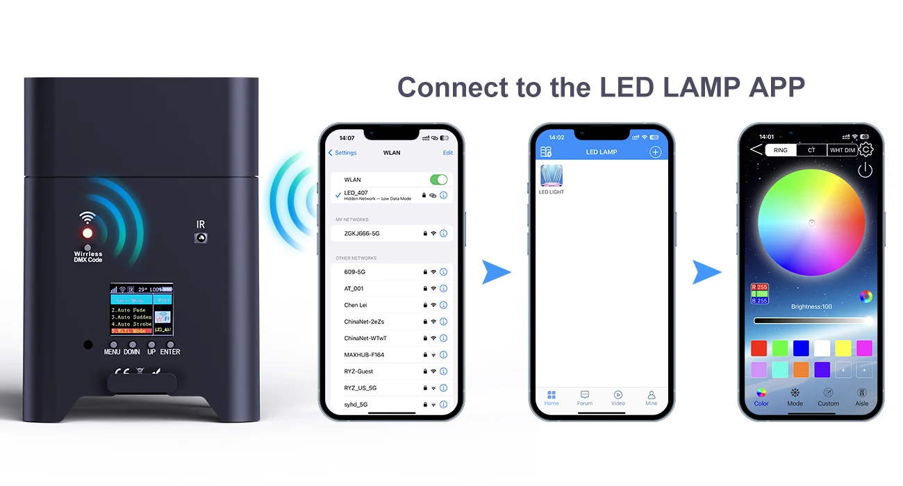 4.Múltiples modos de control: admite DMX, autopropulsado, control por voz, control maestro-esclavo y aplicación móvil, lo que brinda a los usuarios más opciones y flexibilidad.