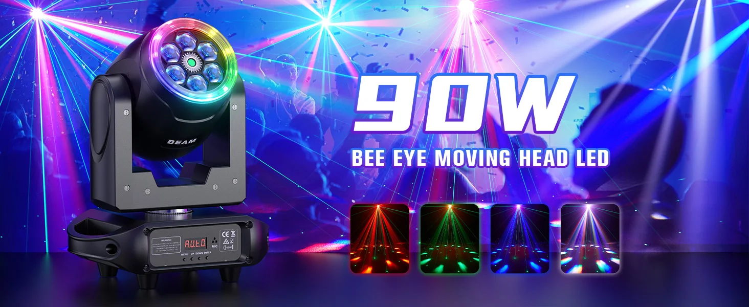Comprar U'King 90W RGBW Luces con cabezales móviles 360 ° Tira de halo de rotación, ojo de abeja, láser verde, luz de escenario DMX, luces de DJ para fiesta de boda