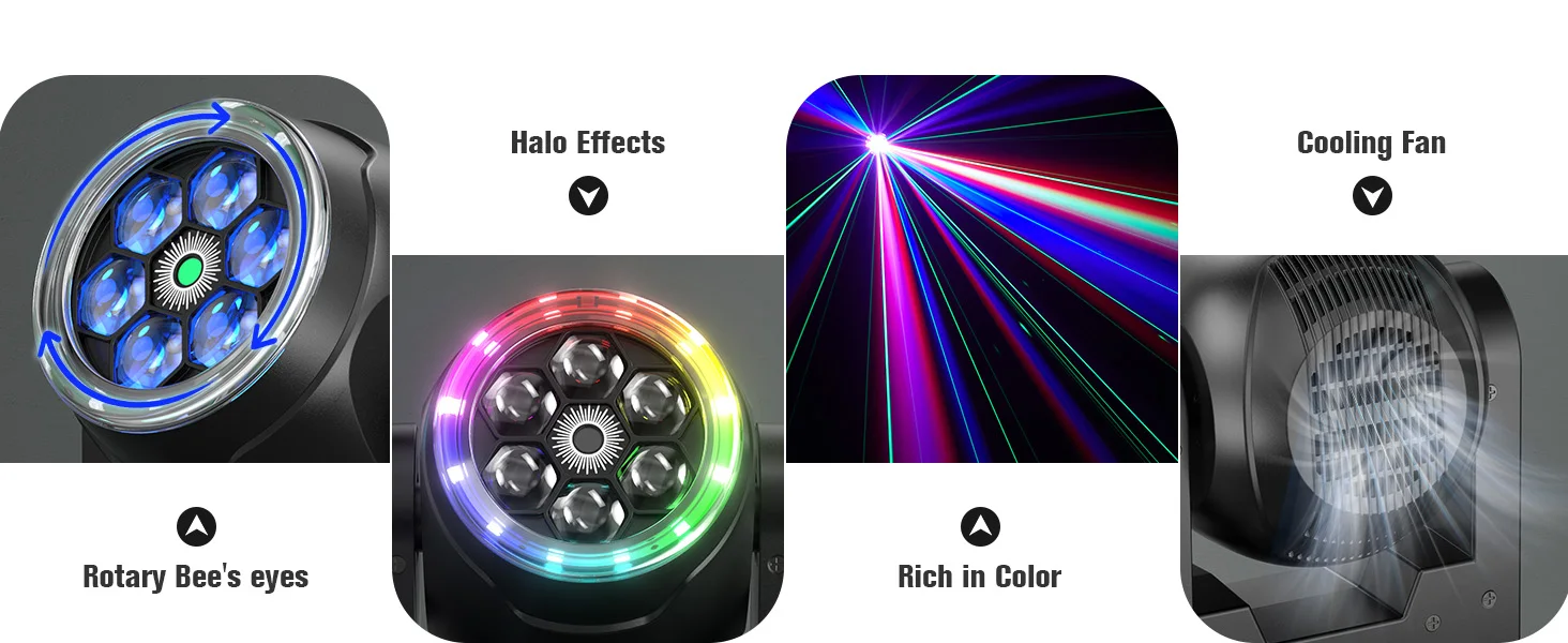 La Sharp Sword Six Bees Eye + Strip es un producto de iluminación versátil que combina el efecto de haz de alta precisión de un disco ocular de abejas con la banda de luz suave que rodea una tira en funcionamiento. Esta combinación única puede infundir cualquier escena con energía infinita y es perfecta para una variedad de eventos como conciertos, bailes y fiestas.