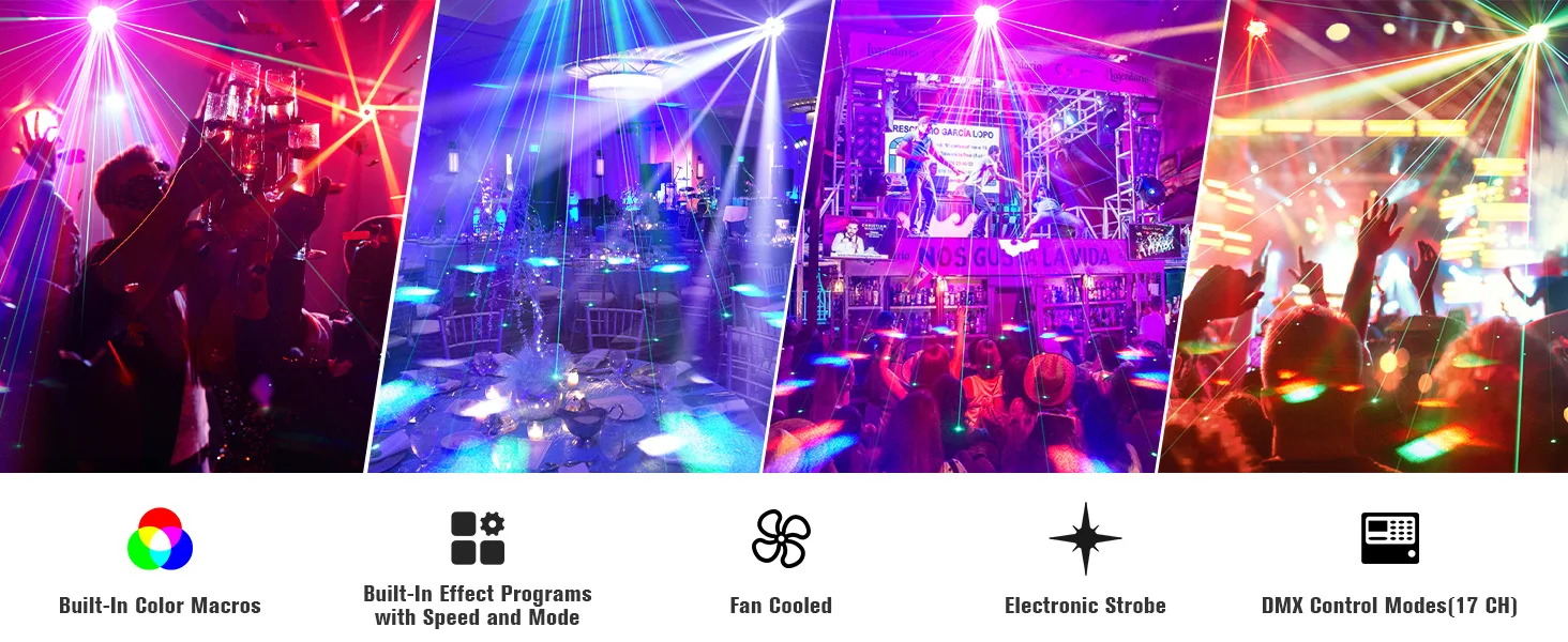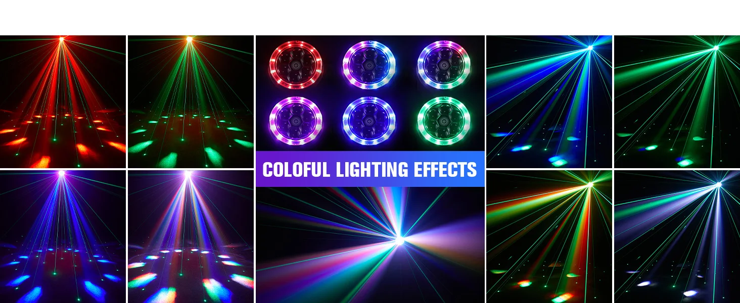 5.【Fuentes de luz vanguardistas】Equipado con 6 luces LED RGBW de 10W, 1 láser verde de 532nm y 50MW y 12 luces LED RGB SMD de 0,2 W, este producto ofrece una amplia gama de opciones de iluminación. La combinación de haces, tiras y láseres garantiza una experiencia de iluminación incomparable.
