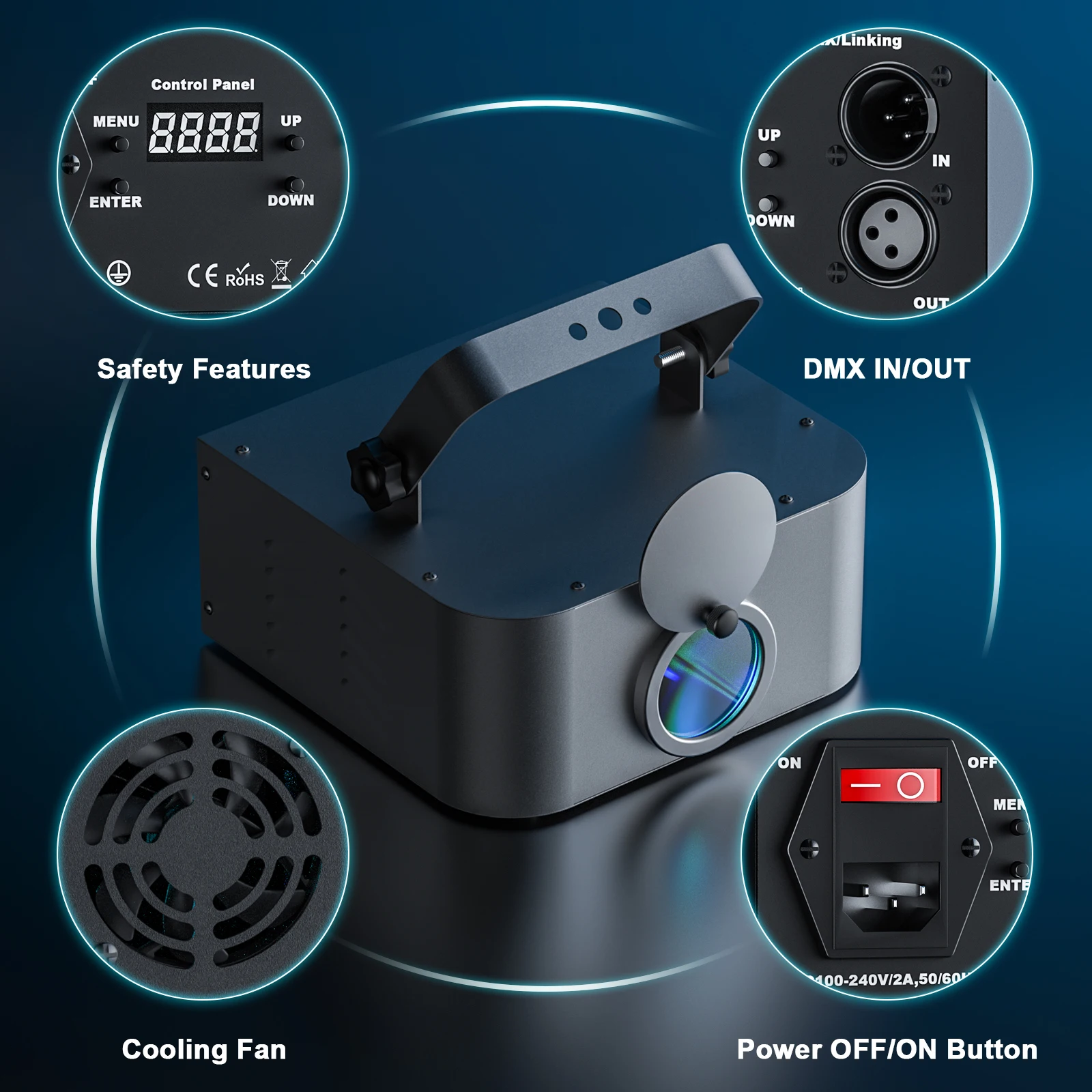 2.Fácil de controlar.Activación de sonido, AUTO-BEAM, animación automática, DMX, maestro/esclavo, control de PC, adaptación a las necesidades de diferentes lugares.