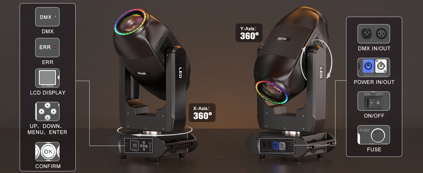 Each head integrates a color wheel, pattern wheel, prism, electronic focus, and iris for independent control. The modular design enables dynamic beam shaping and rich visual combinations.