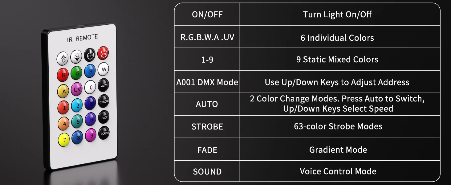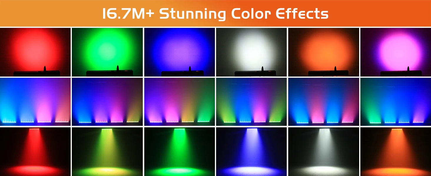 1. Tecnología avanzada de iluminación RGBWA+UV: cuenta con 12 LED RGBWA+UV, que proporcionan luz blanca pura de 6500K, ámbar independiente y colores violeta verdadero para una iluminación auténtica.Utiliza tecnología de mezcla RGB para crear más de 16,7 millones de colores, lo que permite efectos de iluminación vibrantes y dinámicos.