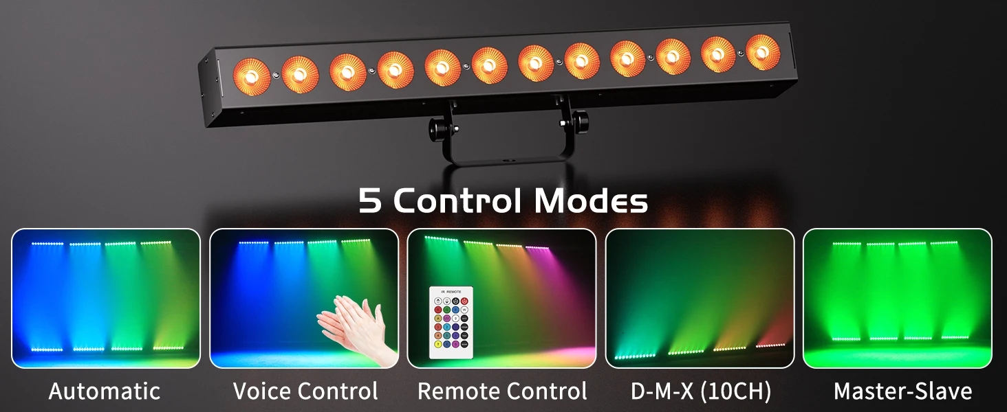 Modo de control: autopropulsado, control activado por sonido, maestro-esclavo, DMX, remoto