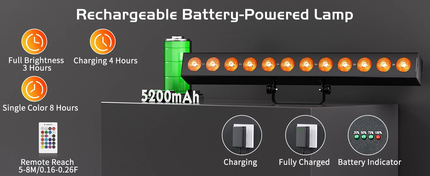 2. Rendimiento de la batería de larga duración: alimentado por una batería recargable incorporada de 5200 mAh, que ofrece hasta 8 horas de funcionamiento en modo de un solo color y 3 horas con brillo total. Ideal para actuaciones y eventos móviles, lo que garantiza flexibilidad y comodidad.