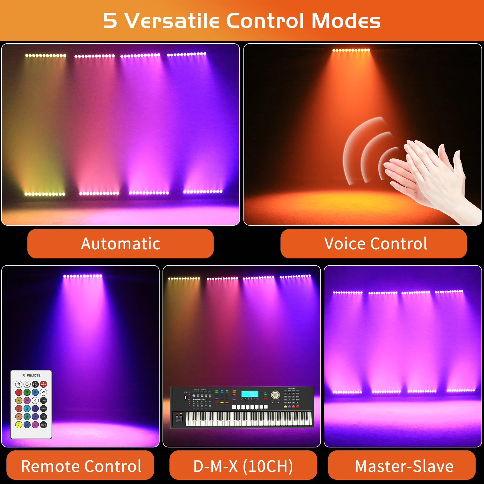 Modo de control: autopropulsado, control activado por sonido, maestro-esclavo, DMX, remoto