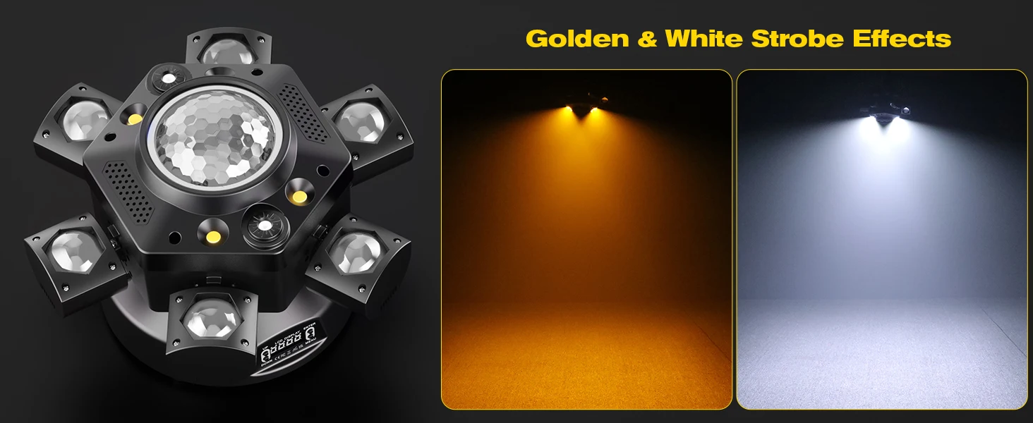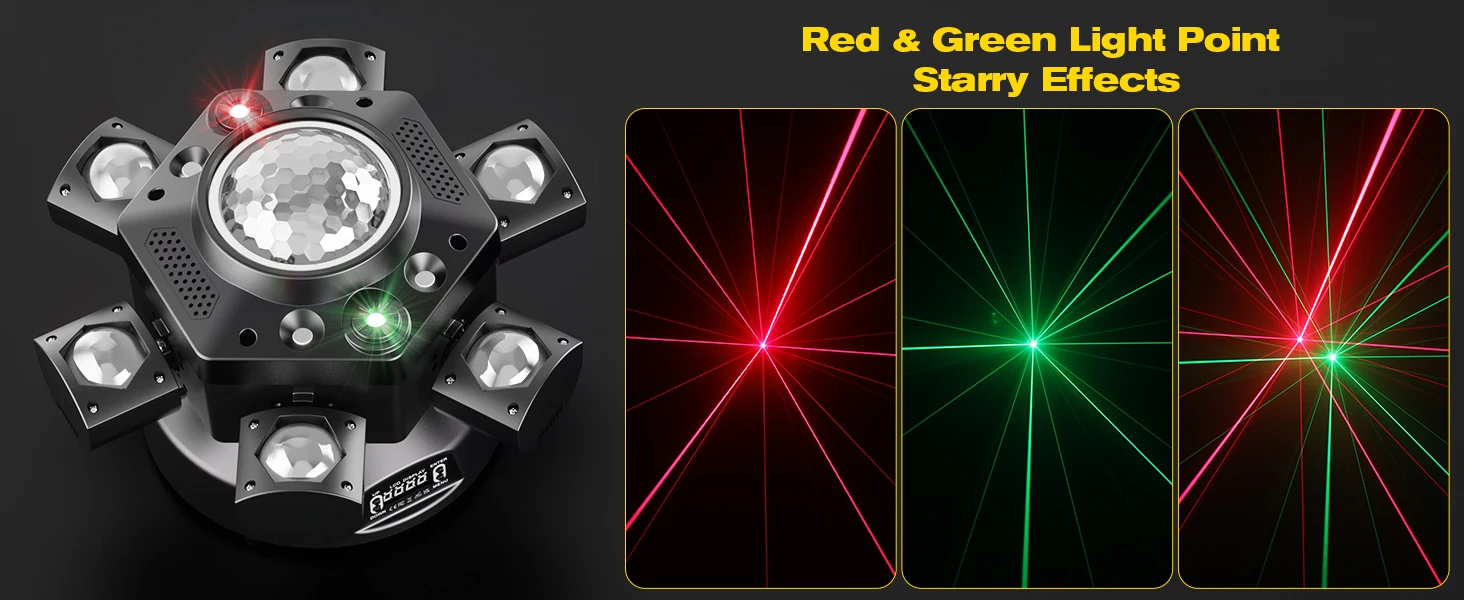 1.Delicia visual multifacética: combina haces, láseres rojos y verdes, efectos de bola mágica y luces estroboscópicas blancas y doradas, brindando una combinación perfecta de varios efectos interesantes para una experiencia visual definitiva.