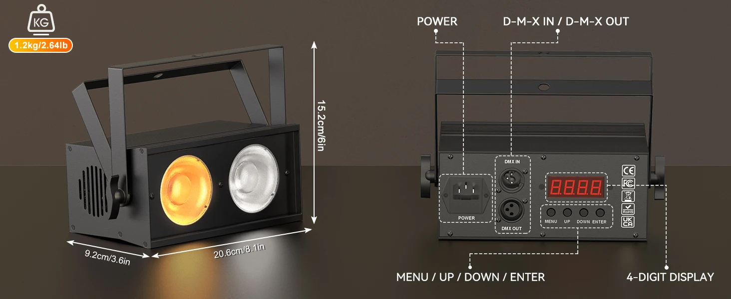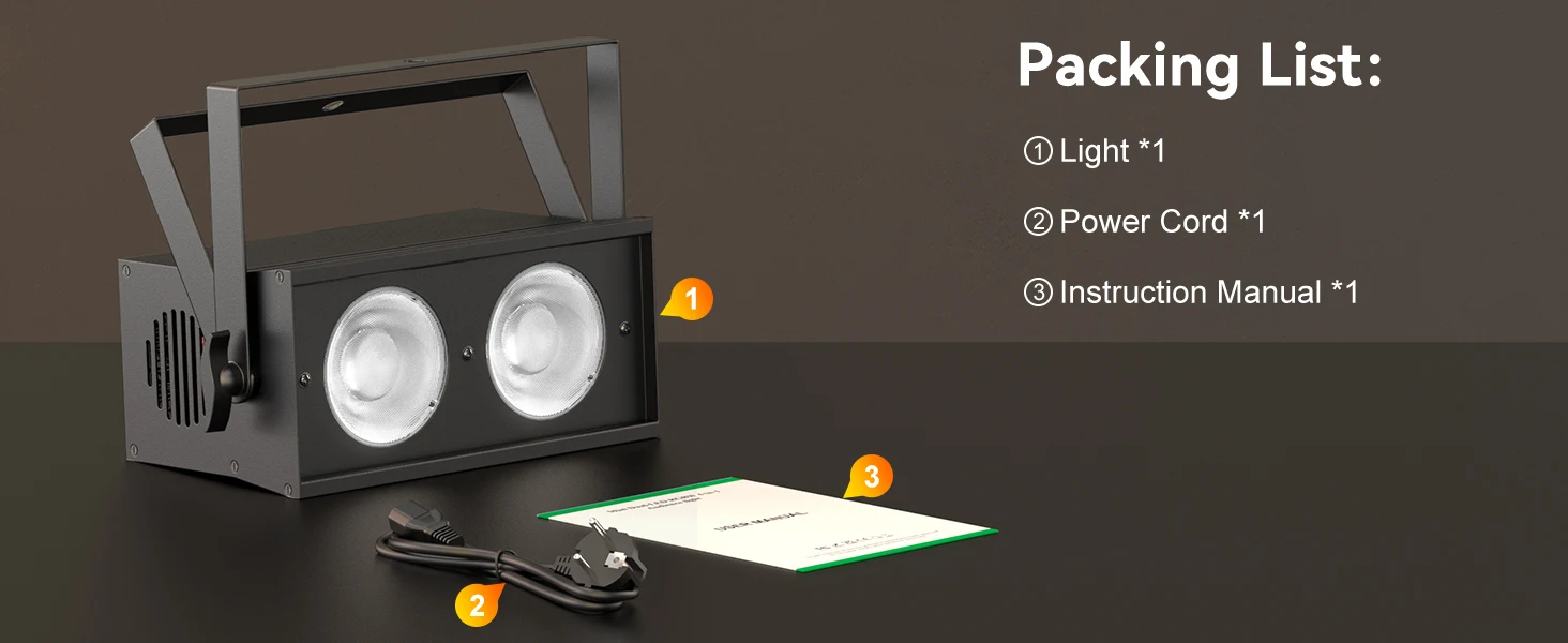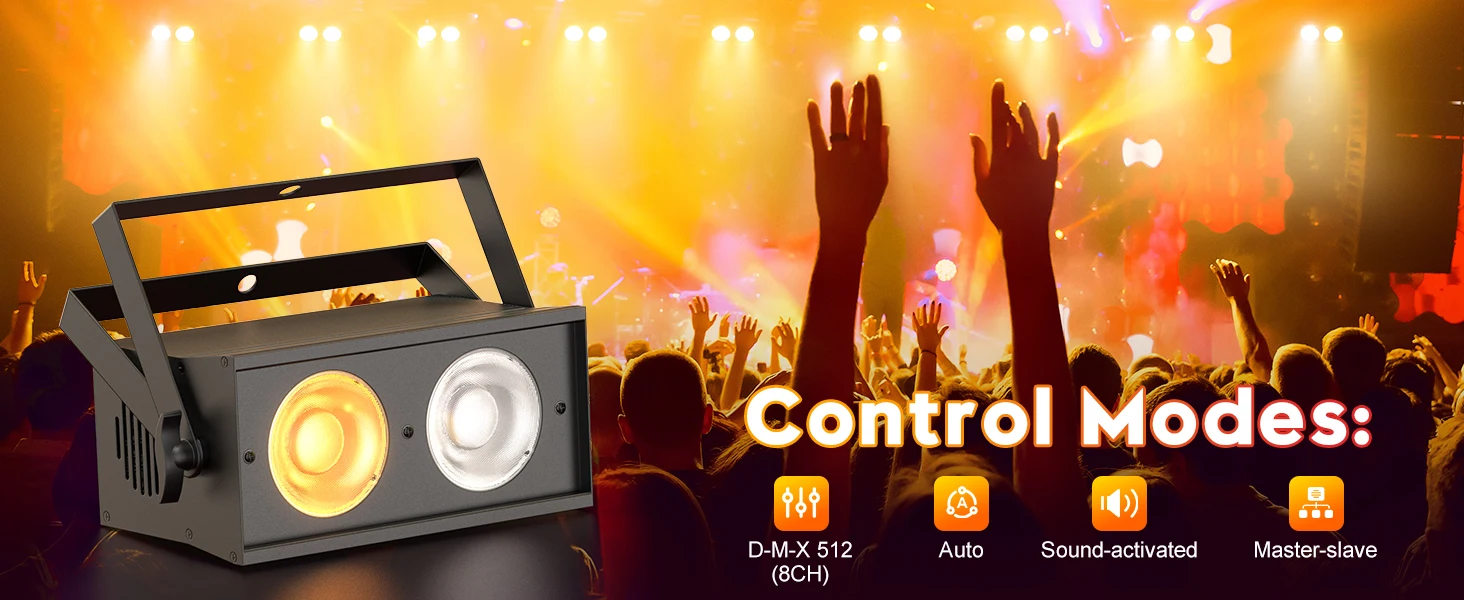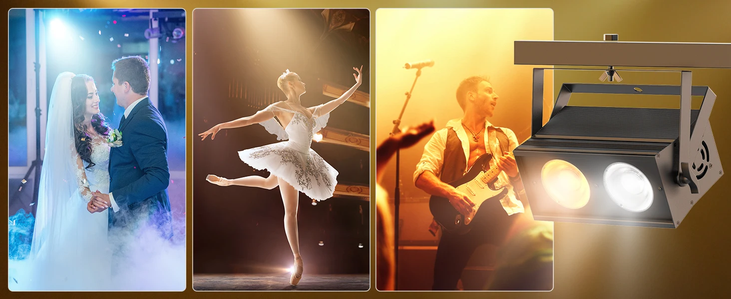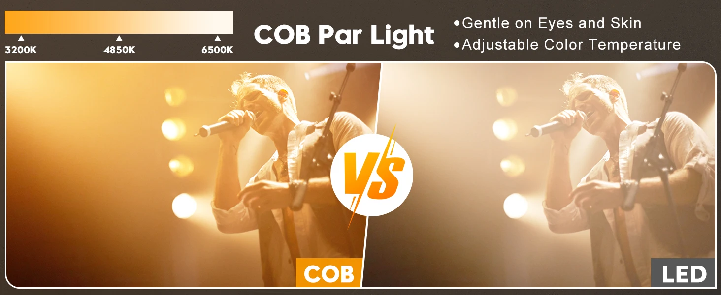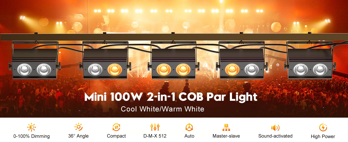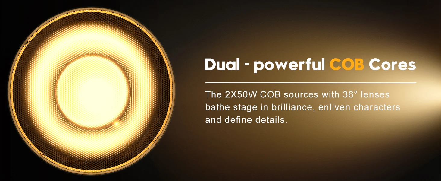 Potente núcleo de iluminación: equipado con dos fuentes de luz COB de alto brillo de 50 W y 36° Lentes ópticas de alta intensidad que proporcionan una luz extremadamente brillante, lo que permite al público ver claramente cada detalle vívido de las actuaciones en el escenario.