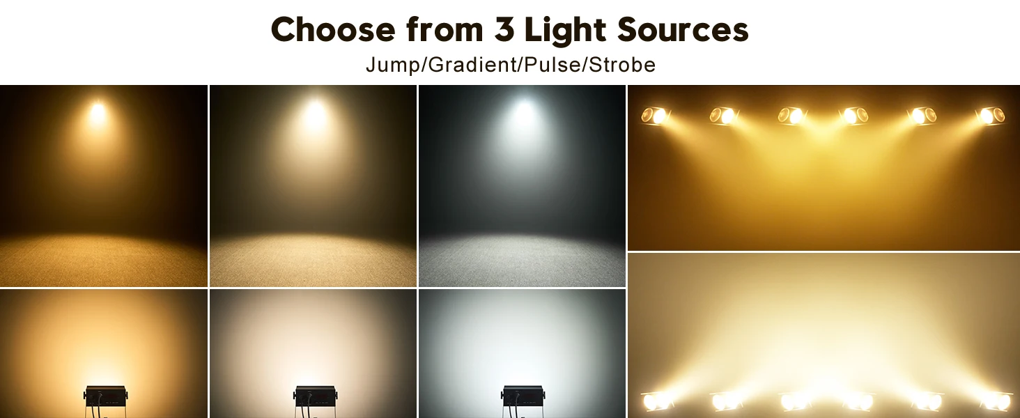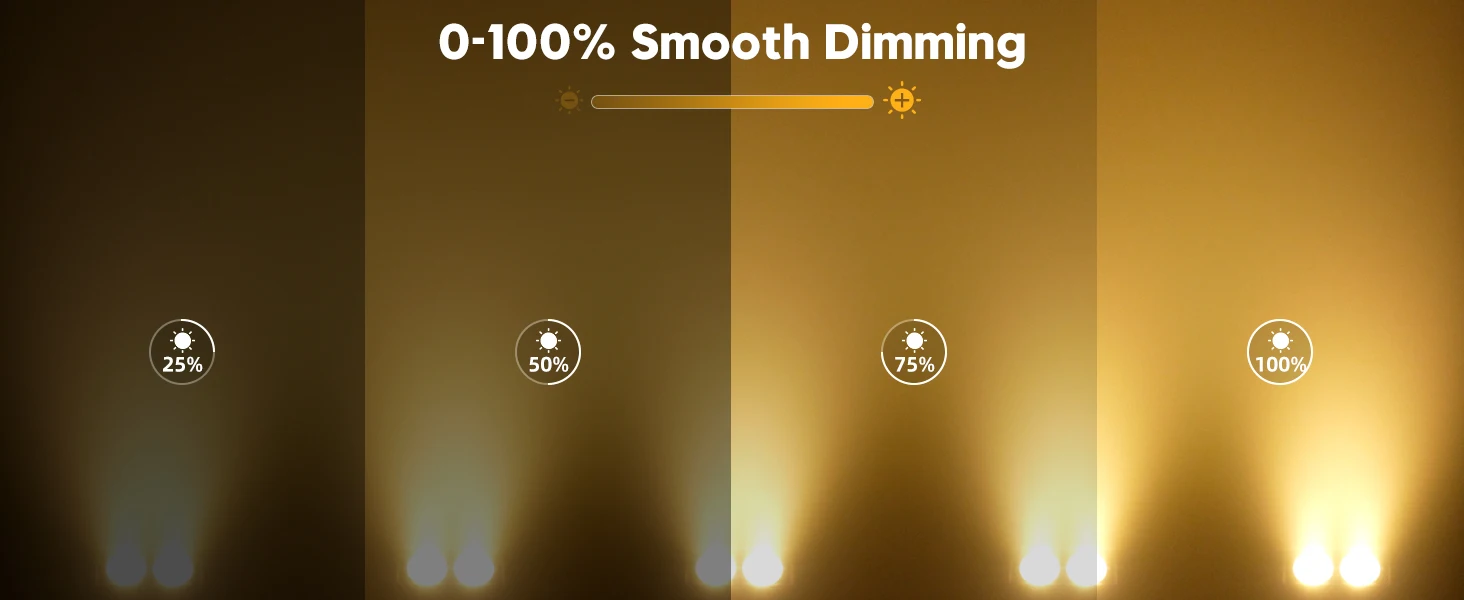 Atenuación flexible y ajuste de temperatura de color: cuenta con atenuación lineal 0 - 100% y control único de un solo punto.La temperatura del color se puede ajustar de 3200 a 6500 K entre blanco cálido y blanco puro, creando varios efectos visuales.