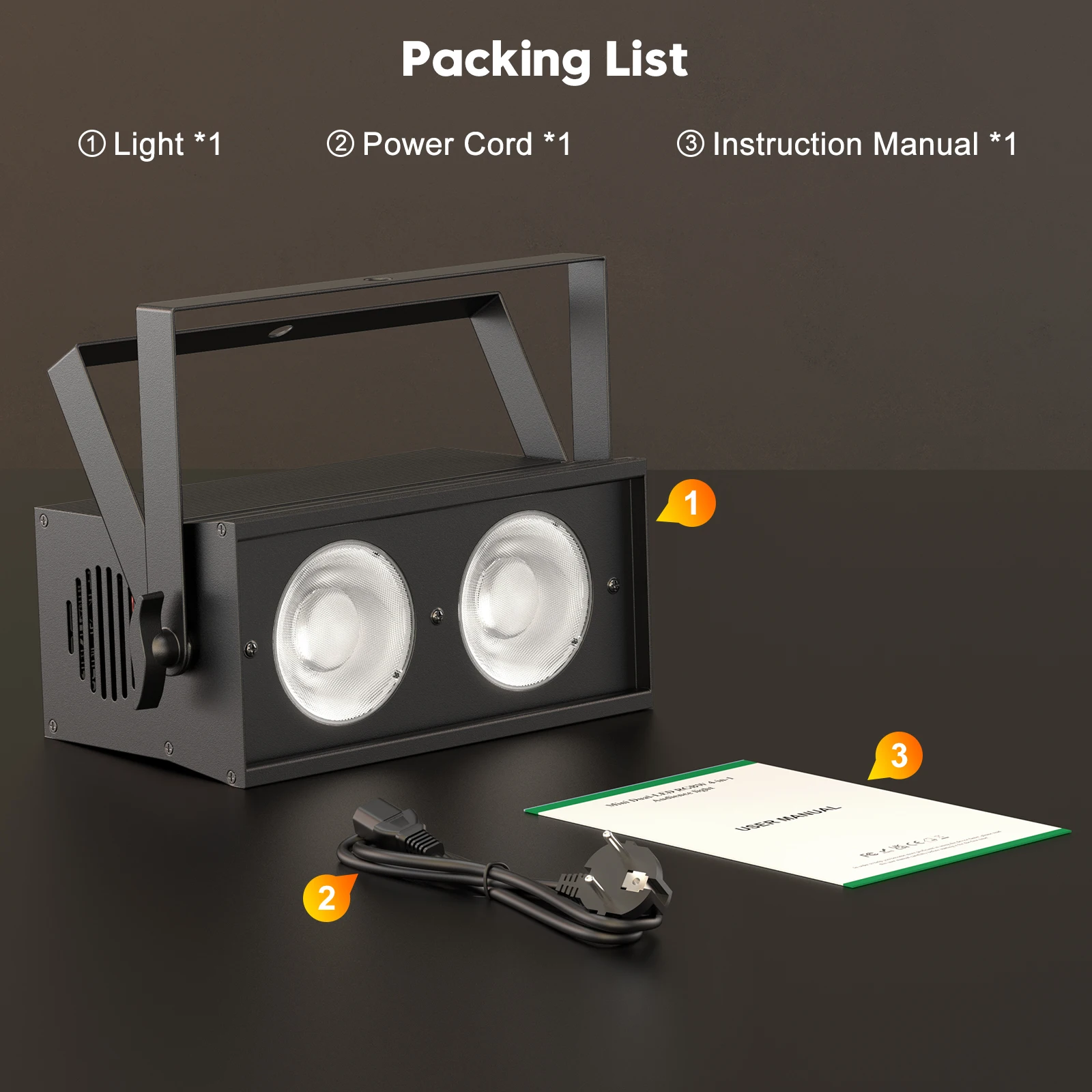 Potente núcleo de iluminación: equipado con dos fuentes de luz COB de alto brillo de 50 W y 36° Lentes ópticas de alta intensidad que proporcionan una luz extremadamente brillante, lo que permite al público ver claramente cada detalle vívido de las actuaciones en el escenario.