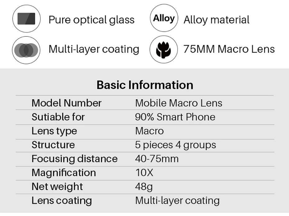 Consejos: utilice esta lente con enfoque 1X y distancia de 40 a 75 mm