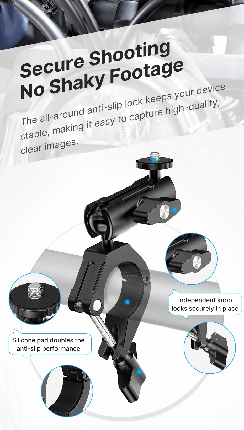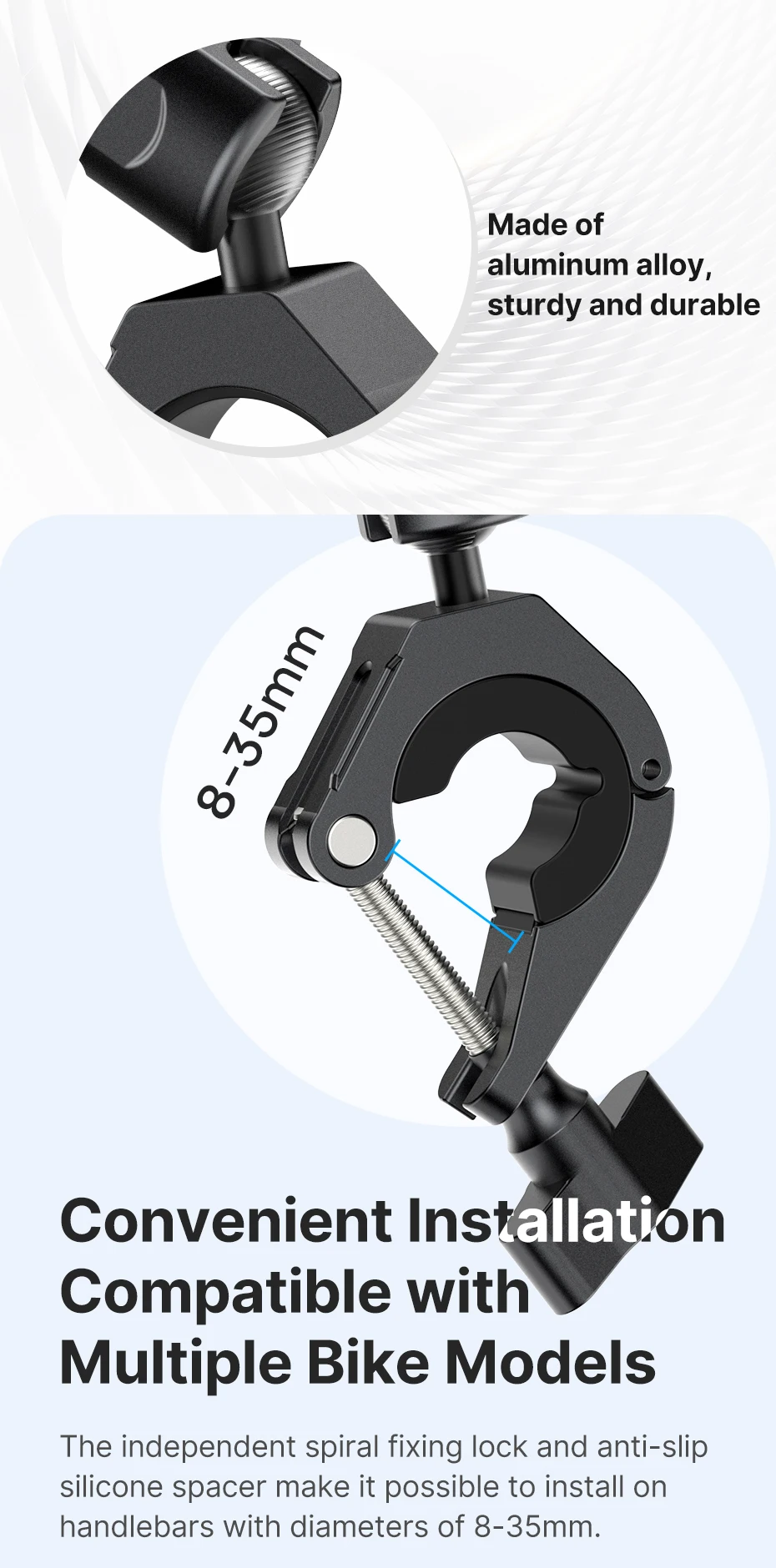 Excelente soporte. Cuerpo de aluminio, buen ensamblaje. Se fija de manera segura con tornillos en cualquier posición.