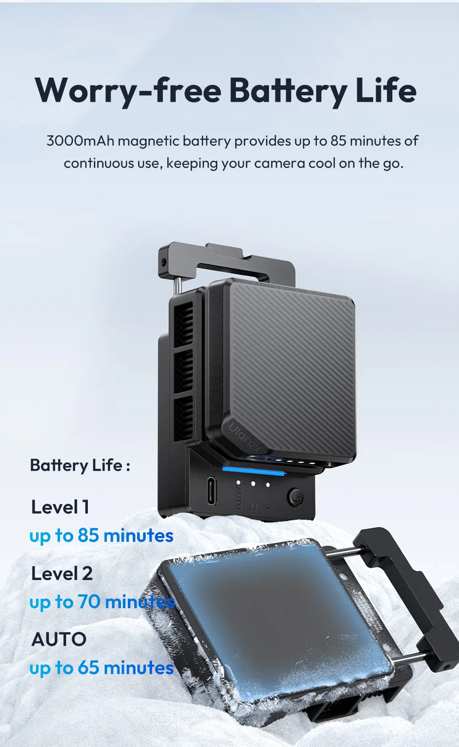 Battery Life:Level 1 ≈ 85min, Level 2 ≈ 65min, AUTO level ≈ 65min