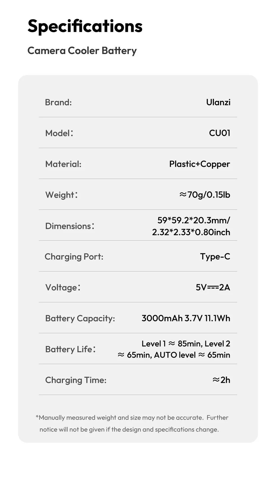 Camera Cooler Battery Specifications: