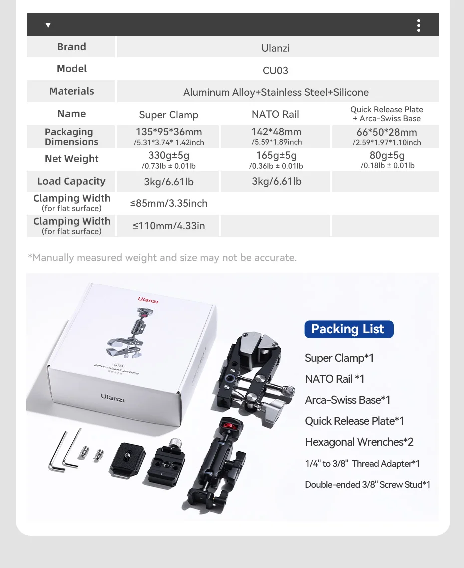 Comprar Ulanzi CU03 súper abrazadera multifuncional, súper abrazadera de liberación rápida, carga de 3KG para luz de cámara para pata de trípode de tubo redondo de escritorio