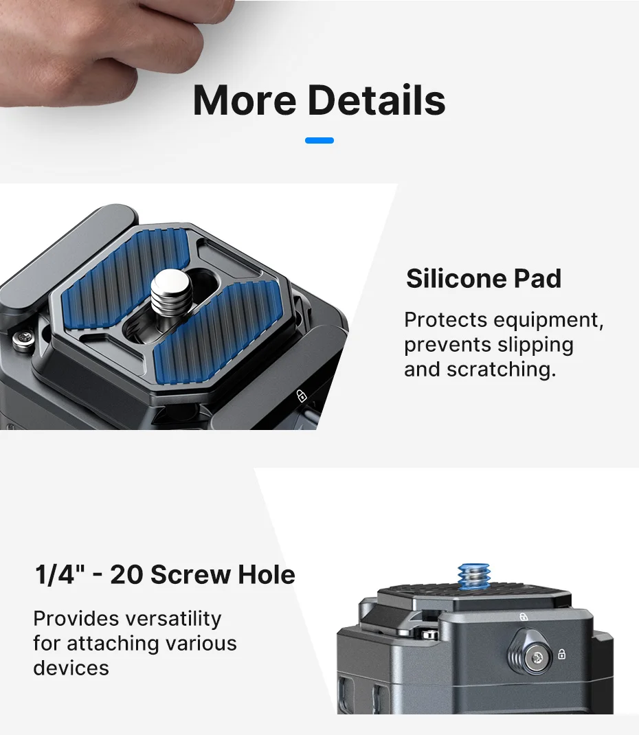 4. Compatibilidad versátil para una amplia gama de dispositivos: diseño de montaje con tornillos desmontable, compatible con tornillos de 1/4''-20 y 3/8"-16, adecuado para usar con trípodes, deslizadores y otros equipos.