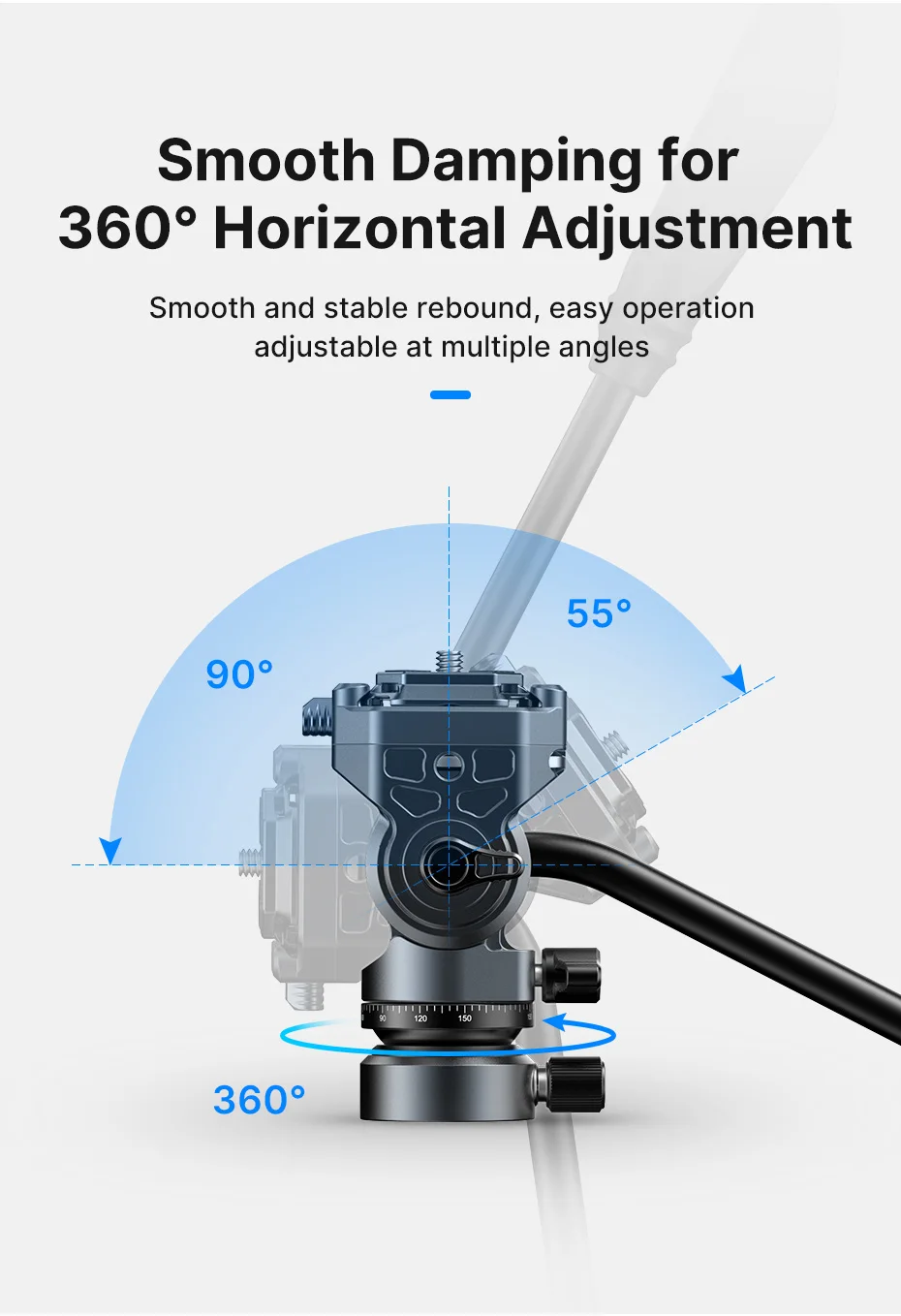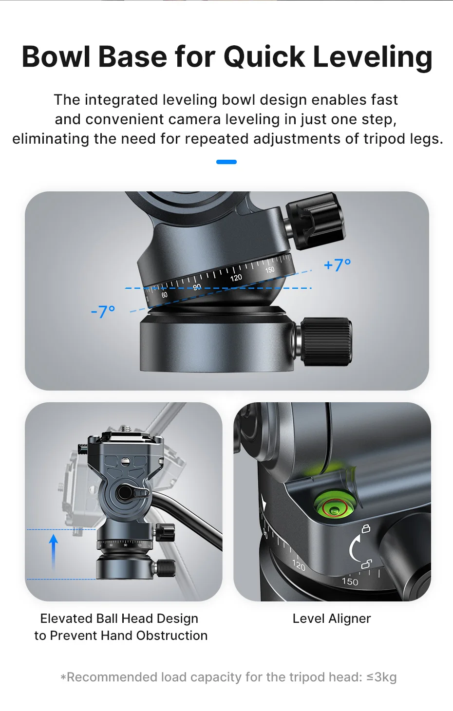 2. Base del cuenco para un nivelación rápida: el diseño del cuenco nivelador integrado permite una nivelación rápida y cómoda de la cámara en solo un paso, eliminando la necesidad de ajustes repetidos de las patas del trípode.