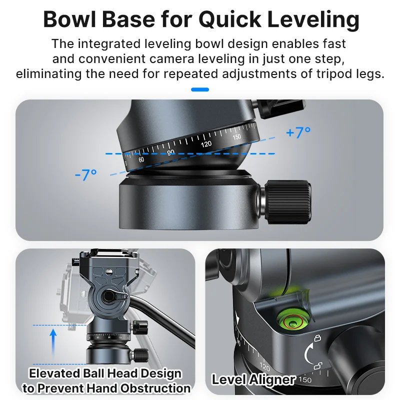 2. Base del cuenco para un nivelación rápida: el diseño del cuenco nivelador integrado permite una nivelación rápida y cómoda de la cámara en solo un paso, eliminando la necesidad de ajustes repetidos de las patas del trípode.