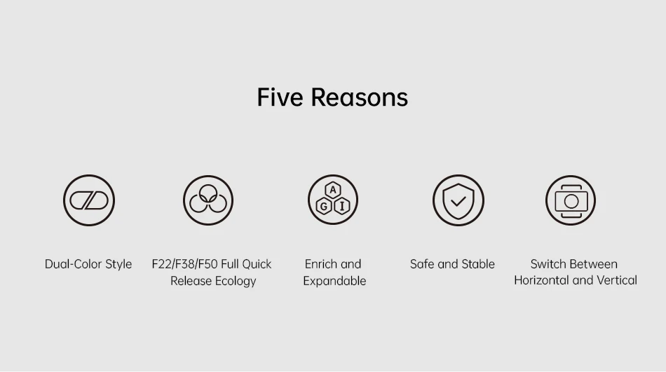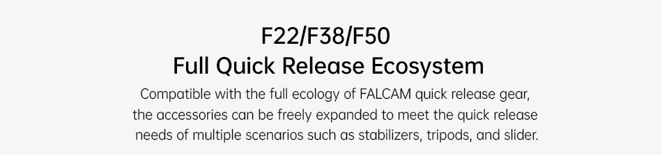 4. Ecosistema de liberación rápida completa F22/F38/F50: Compatible con la ecología completa del equipo de liberación rápida FALCAM, los accesorios se pueden expandir libremente para satisfacer las necesidades de liberación rápida de múltiples escenarios como estabilizadores, trípodes y deslizadores.