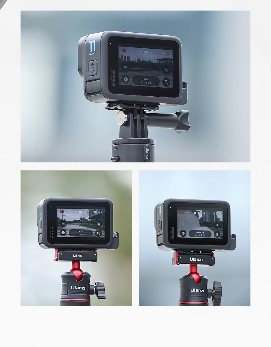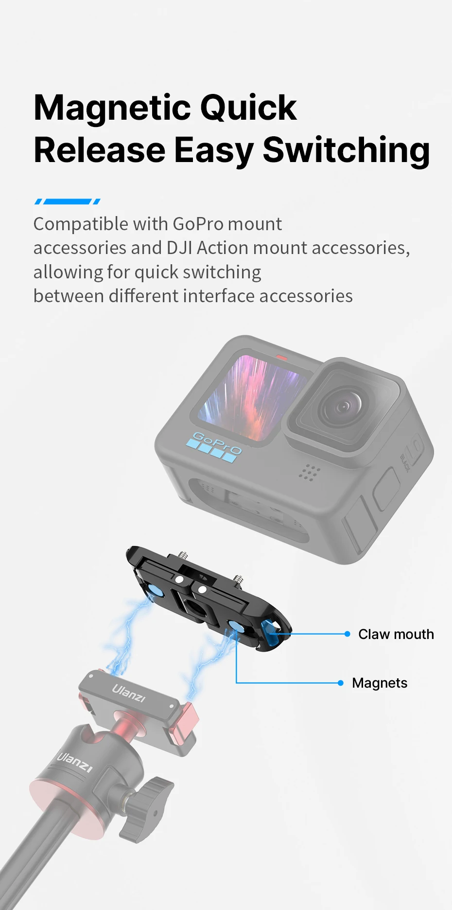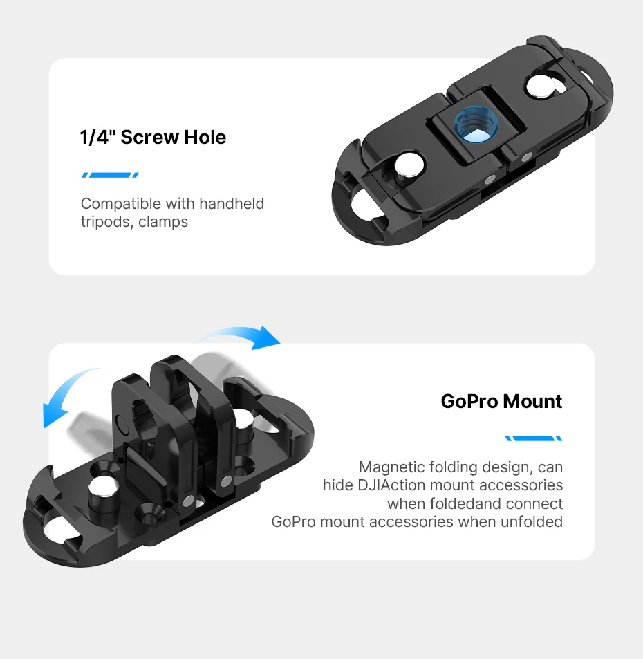 1. Liberación rápida magnética, cambio fácil: Compatible con accesorios de montaje GoPro y accesorios de montaje de acción DJI, lo que permite un cambio rápido entre diferentes accesorios de interfaz