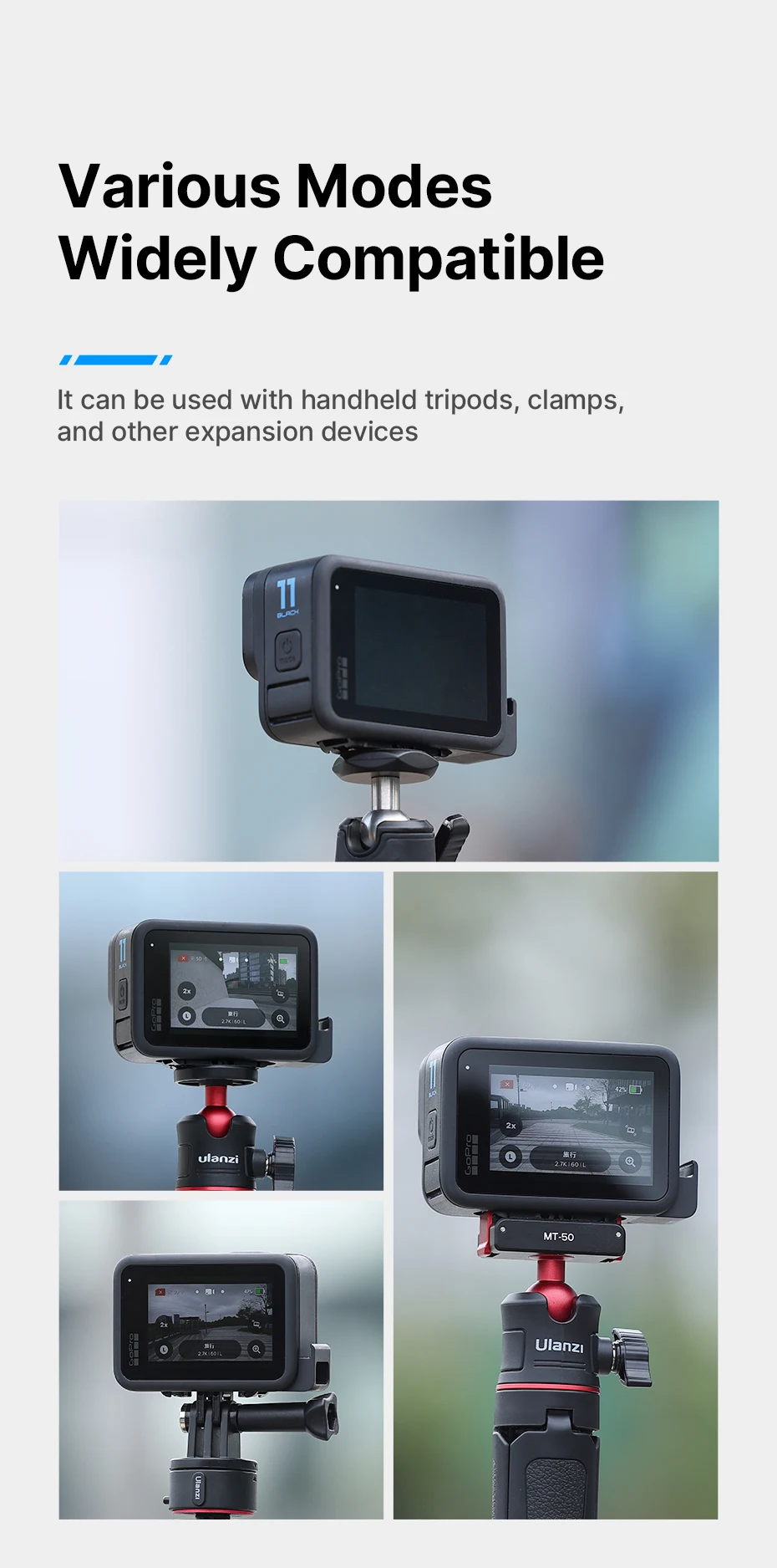 4. Varios modos, ampliamente compatibles: se puede utilizar con trípodes de mano, abrazaderas y otros dispositivos de expansión