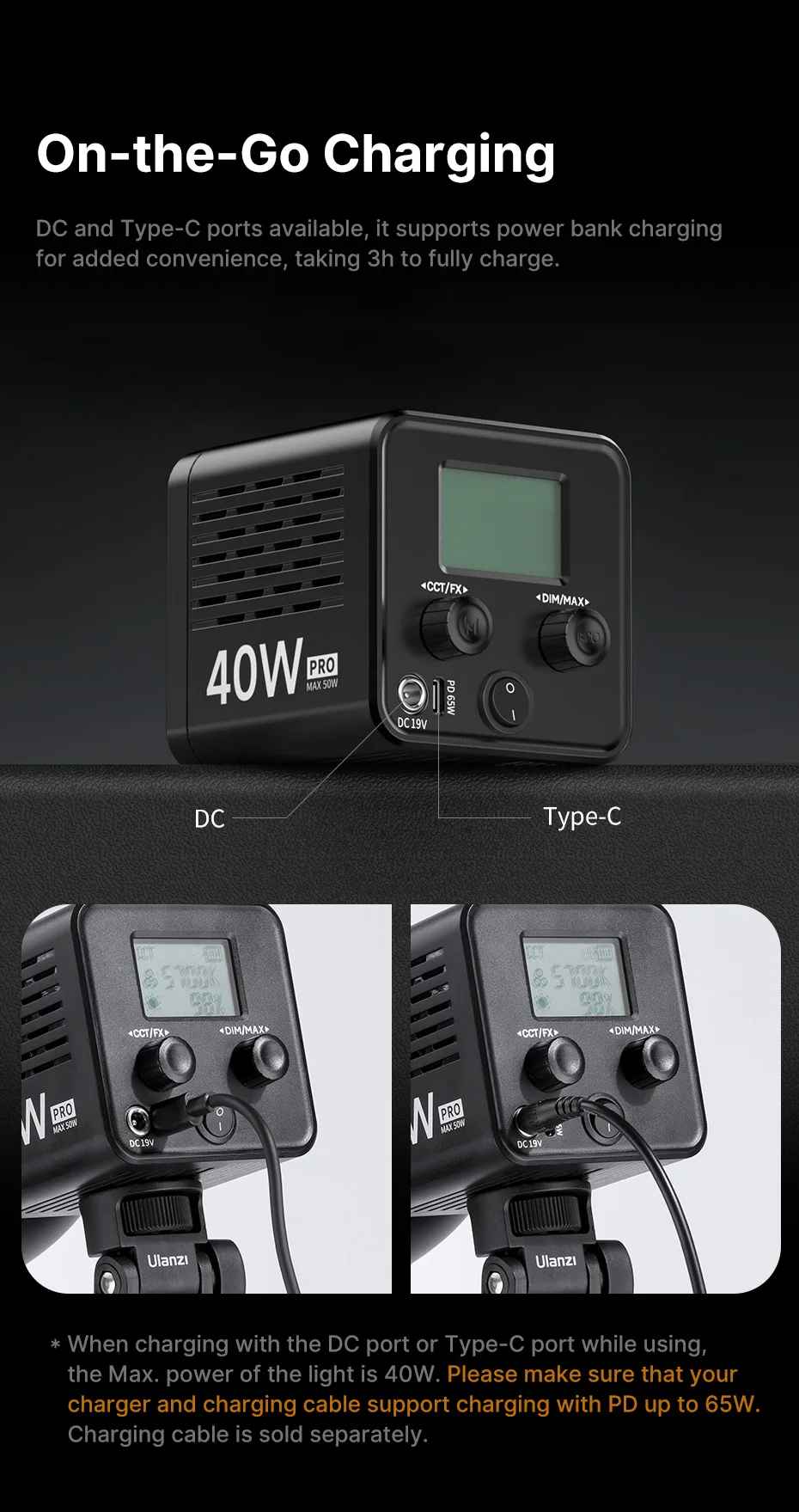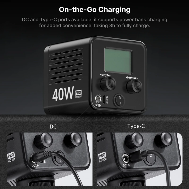 Consejos:Cuando se carga con el puerto CC o el puerto tipo C durante el uso, la potencia máxima de la luz es de 40 W.Asegúrese de que su cargador y cable de carga admitan la carga con PD de hasta 65 W..