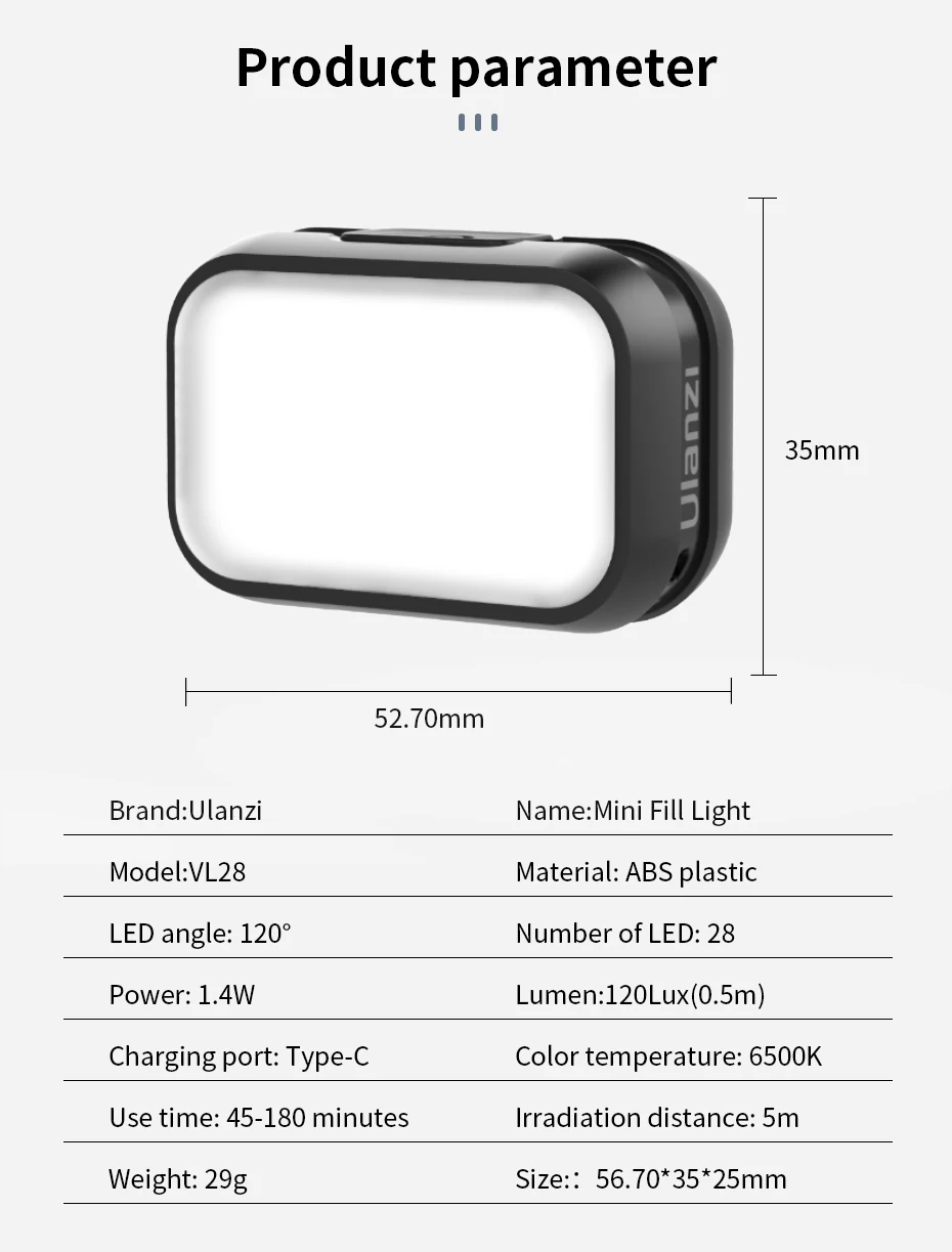 Comprar Ulanzi-luz LED para vídeo Vlog VL28, 6500K, Ultra Mini, recargable, ajustable, para Youtube, Selfie, luz de carga tipo C