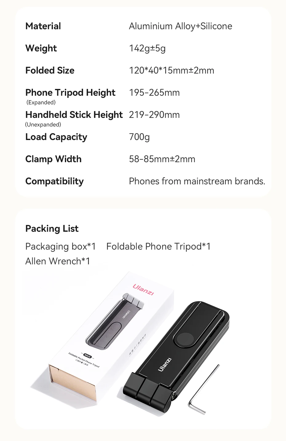 Presentamos el trípode de teléfono de bolsillo plegable Ulanzi MA26 M007, ¡su compañero de fotografía de bolsillo! Fácilmente ajustable para ángulos versátiles, este trípode cambia sin problemas entre los modos vertical y horizontal. Su estructura estable de tres pies y su almohadilla de silicona antideslizante mantienen tu teléfono seguro, mientras que los soportes duales de zapata fría permiten accesorios creativos de luz o micrófono. Más allá de ser un soporte para teléfono, es tu compañero de mano para un palo de atracones y vlogging, gracias a su fácil Función de expandir y plegar. Eleve su experiencia de fotografía y vídeo con el Ulanzi MA26, ¡donde la portabilidad se encuentra con la estabilidad!