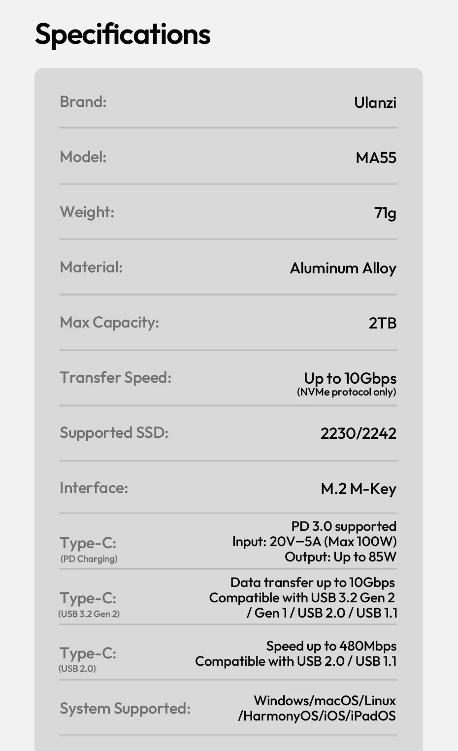 Comprar Ulanzi MA55 Caja SSD magnética Pro Storage 4K ProRes Grabación Transferencia de 10 Gbps Tipo-C Multipuerto para Windows para macOS
