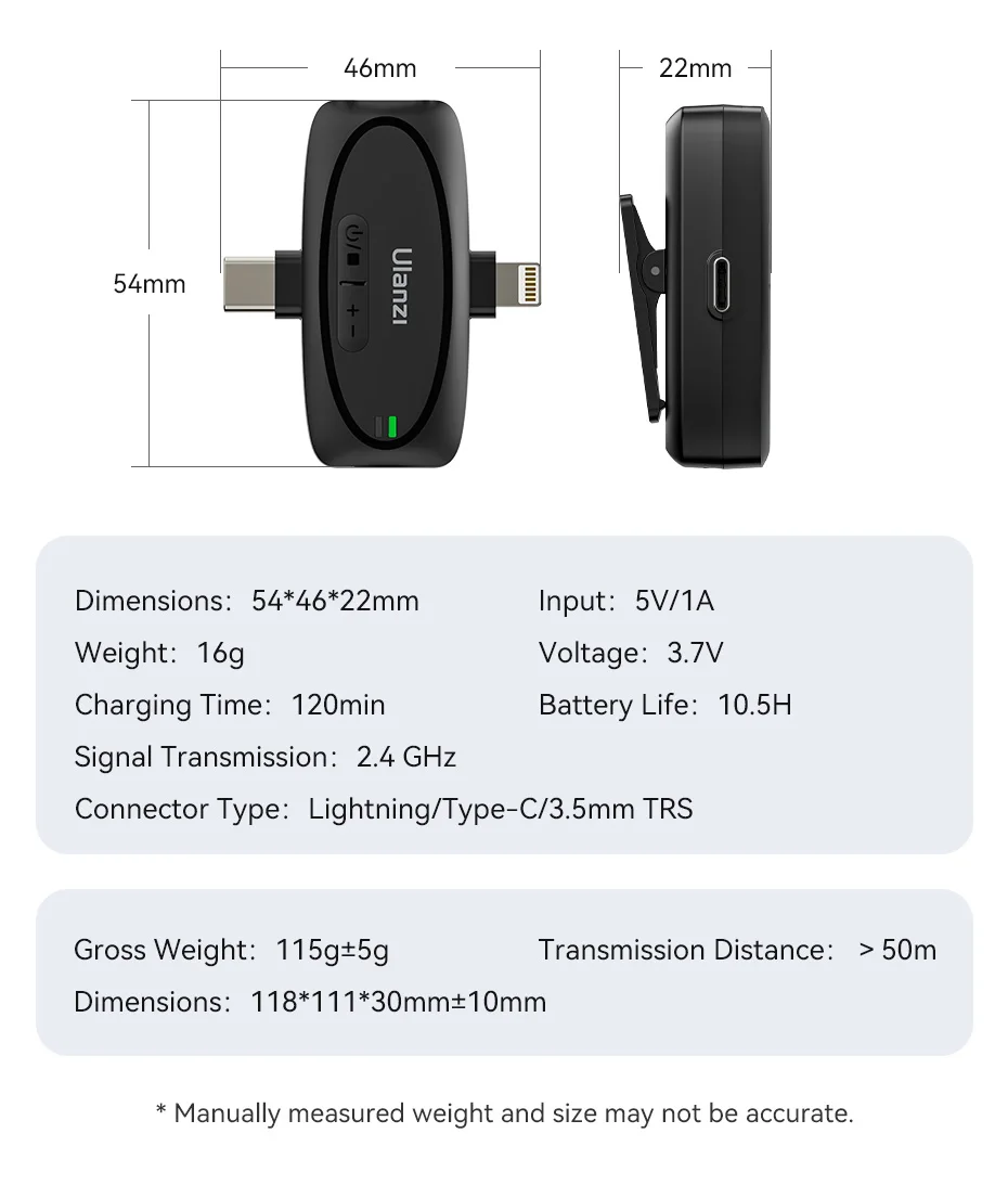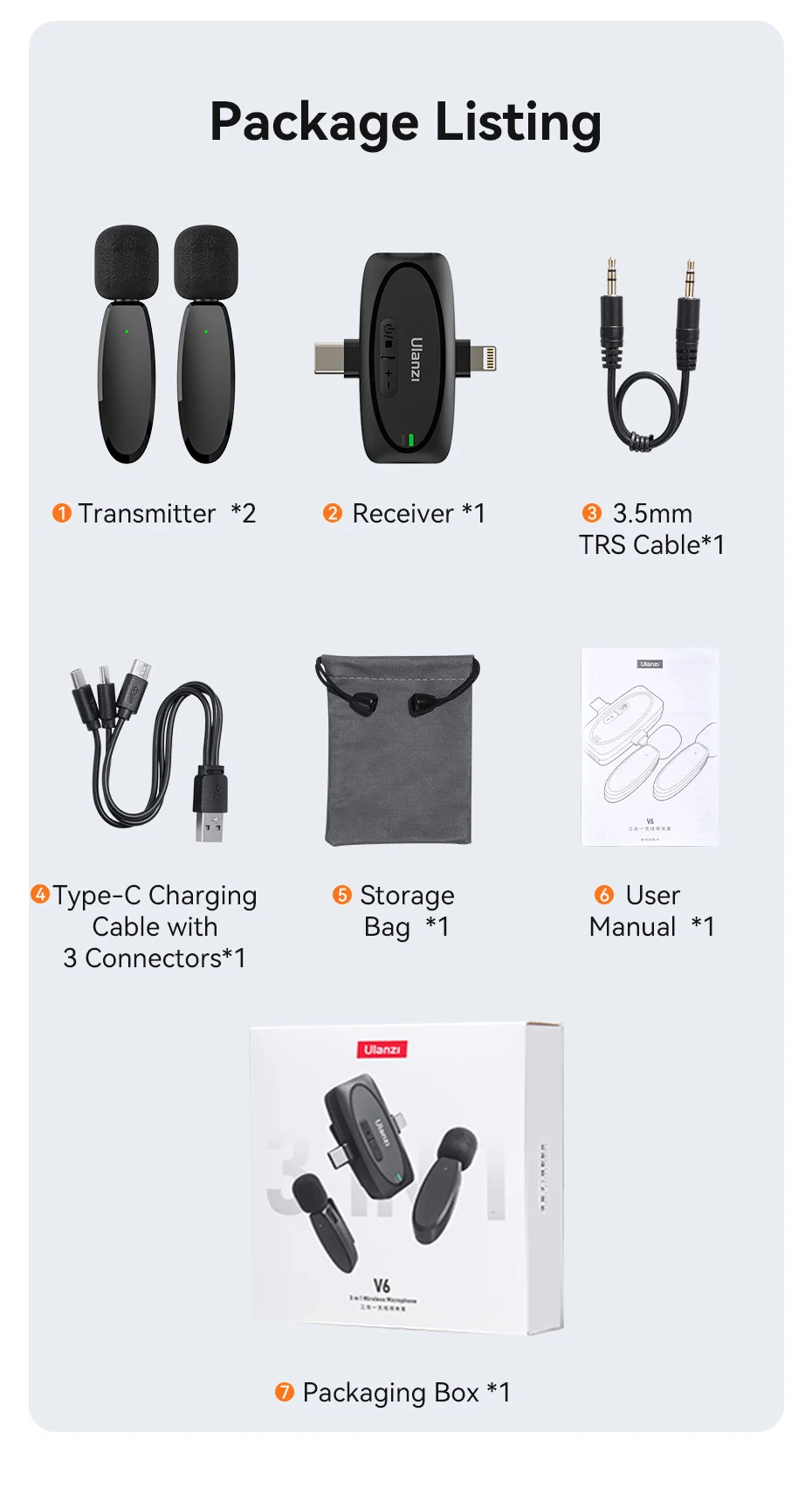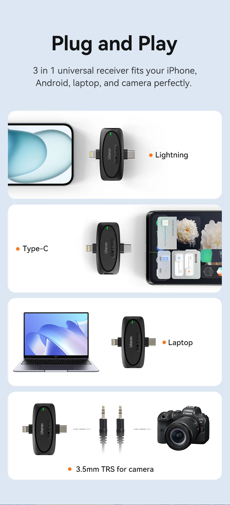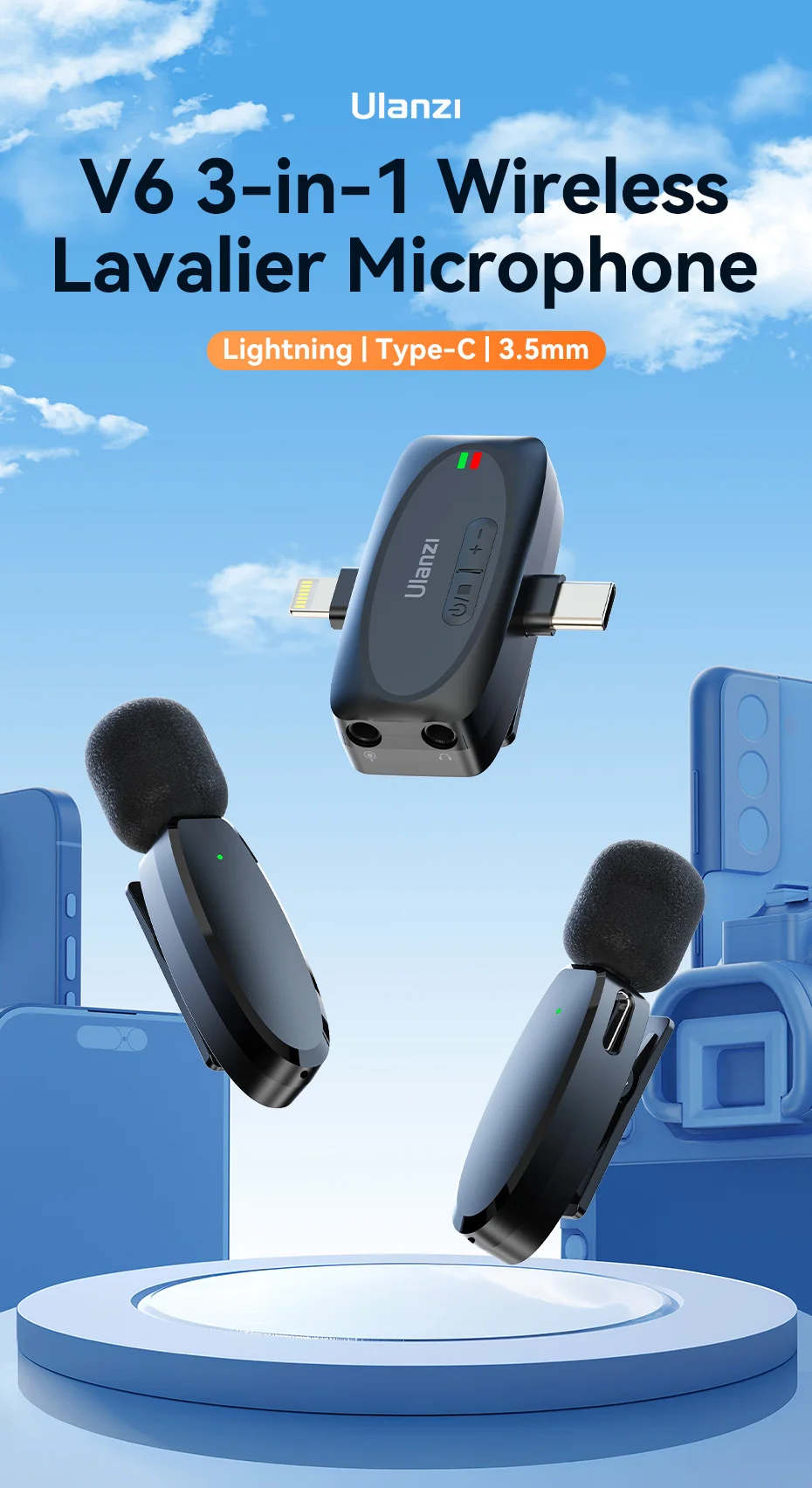Ulanzi-Micrófono de solapa inalámbrico 3 en 1 V6 2,4G, conector Lightning tipo C, puertos de 3,5mm para iPhone 15, cámara DSLR Android, portátil, grabación de entrevista