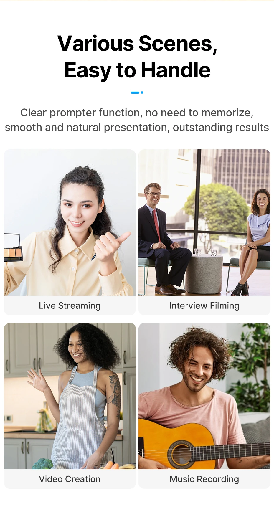 El teleprompter en sí está bien hecho, el empaque está intacto y los materiales son fiables. Sin embargo, la aplicación de Android en chino que se descarga al escanear un código QR es muy incómoda. Por ahora, estoy buscando una aplicación alternativa, pero no ofrecen soporte adecuado para el control remoto que viene con el teleprompter. El producto es bueno, pero el software es malo.