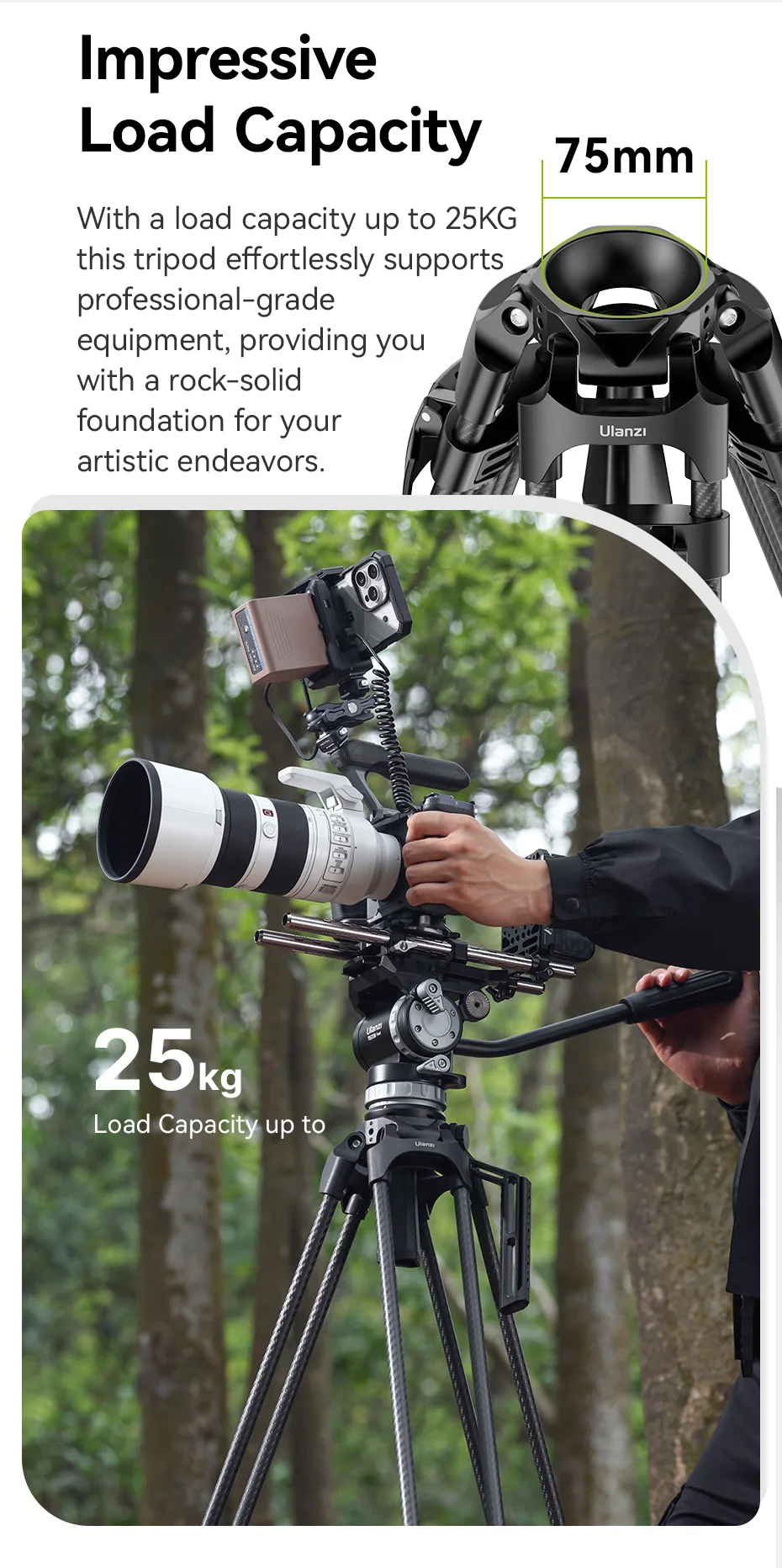 Ulanzi-pata de trípode de fibra de carbono, Base de bola estándar de 75mm, carga de 25kg