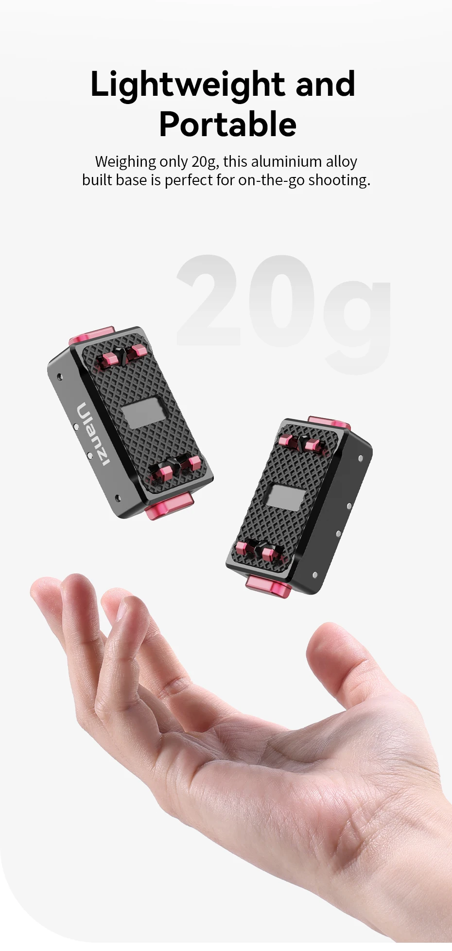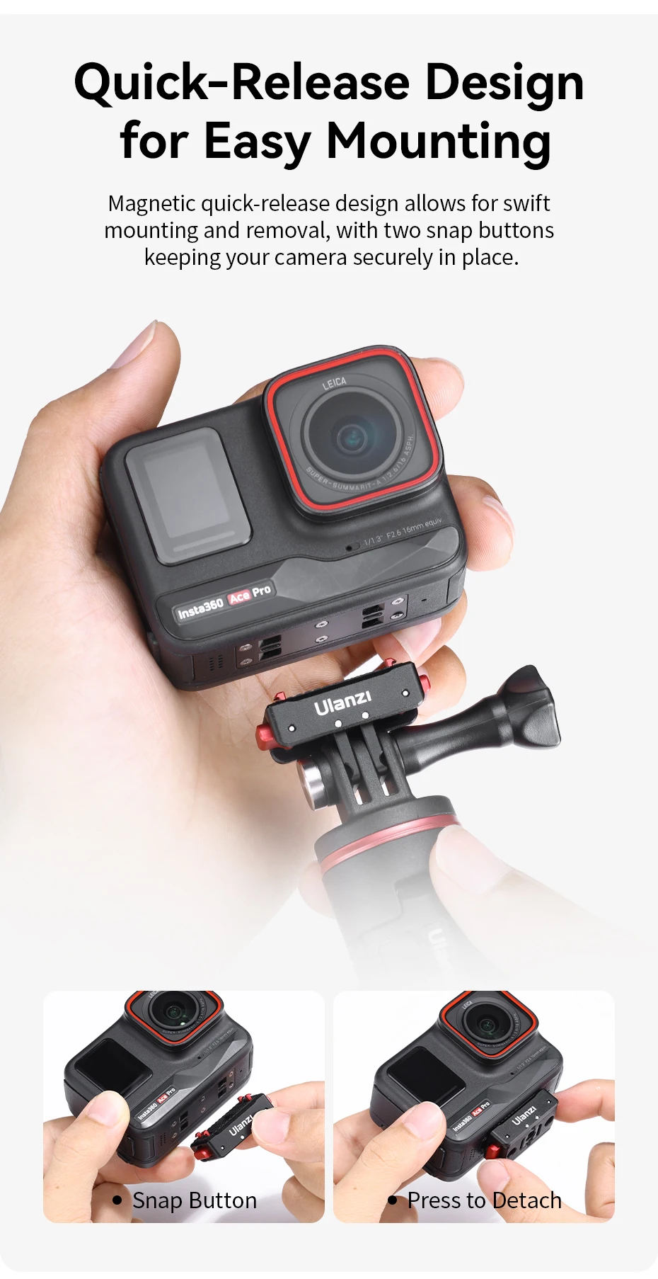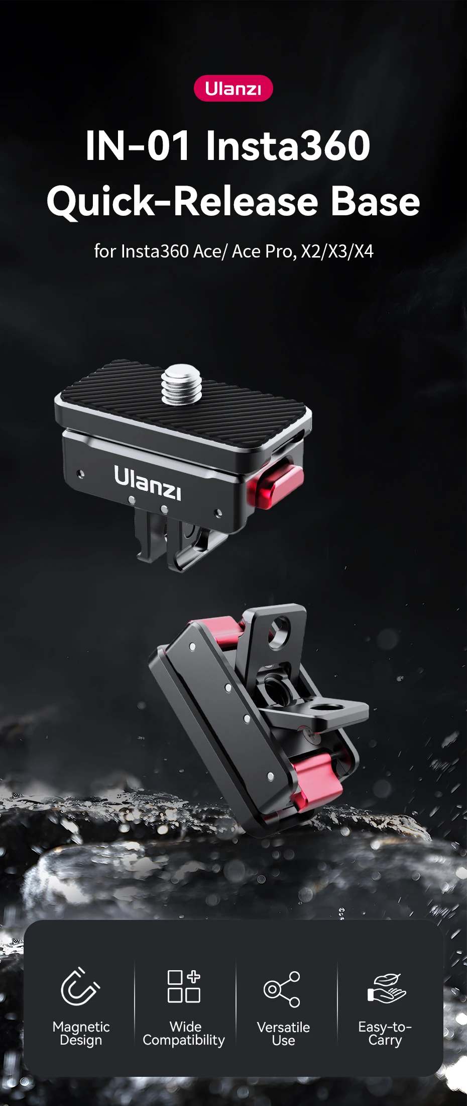 Monte y desmonte rápidamente su cámara de acción Insta360 de su cardán o trípode portátil con este soporte magnético de liberación rápida Ulanzi.Este dispositivo de liberación rápida multiusos, adaptable y magnético presenta un diseño ultrafino que lo hace invisible durante la captura de 360° tiros y un bloqueo de seguridad deslizante integrado evitan una liberación accidental del montaje.