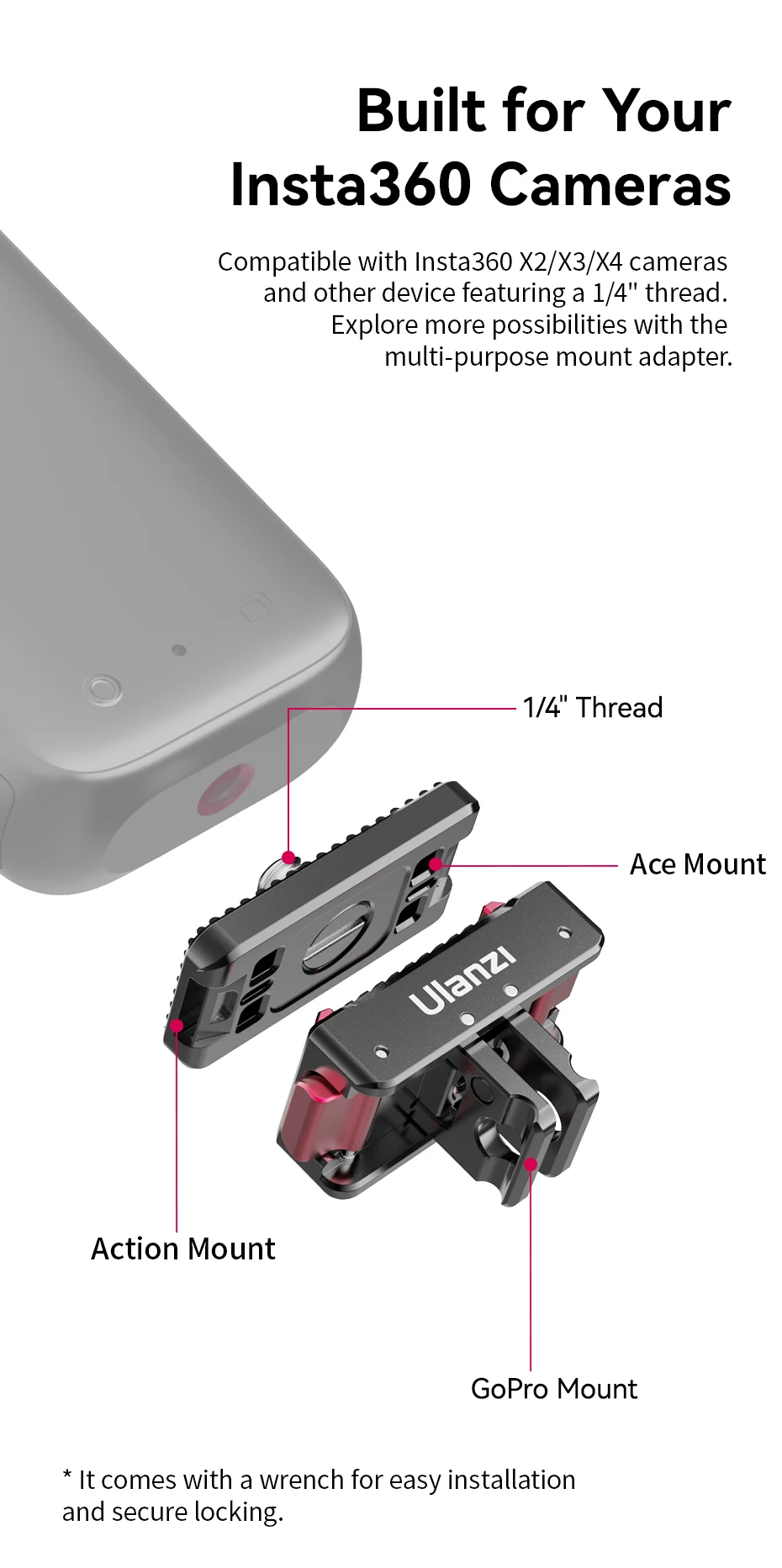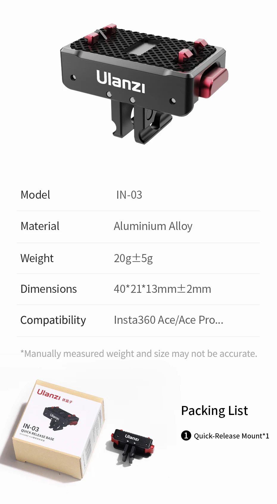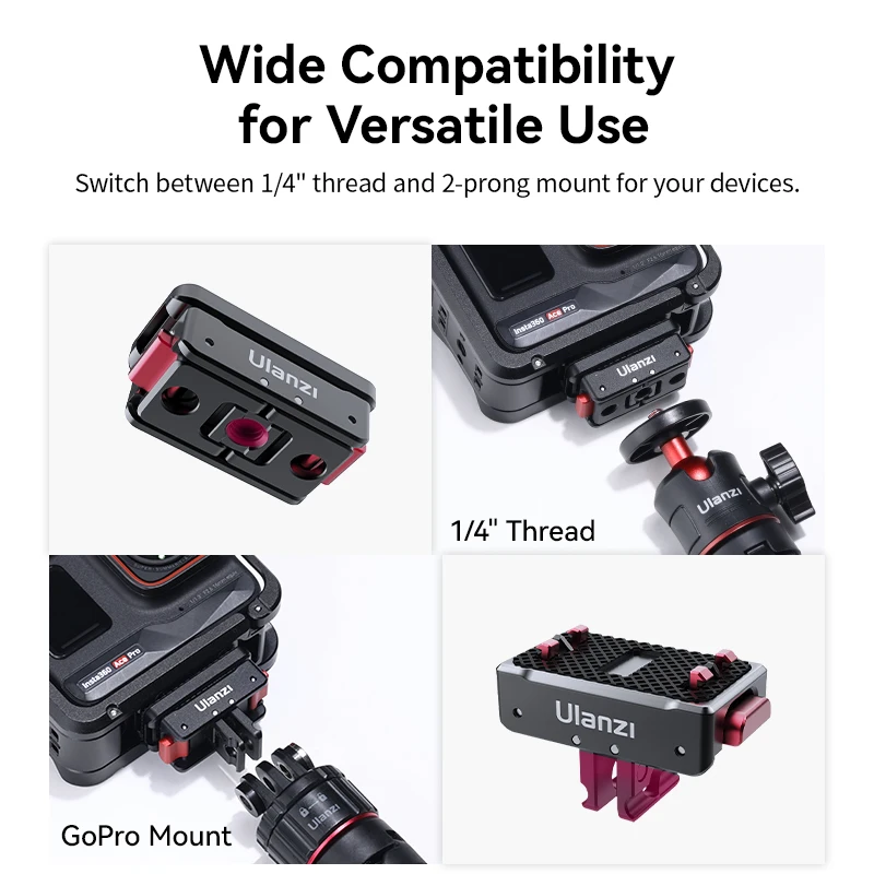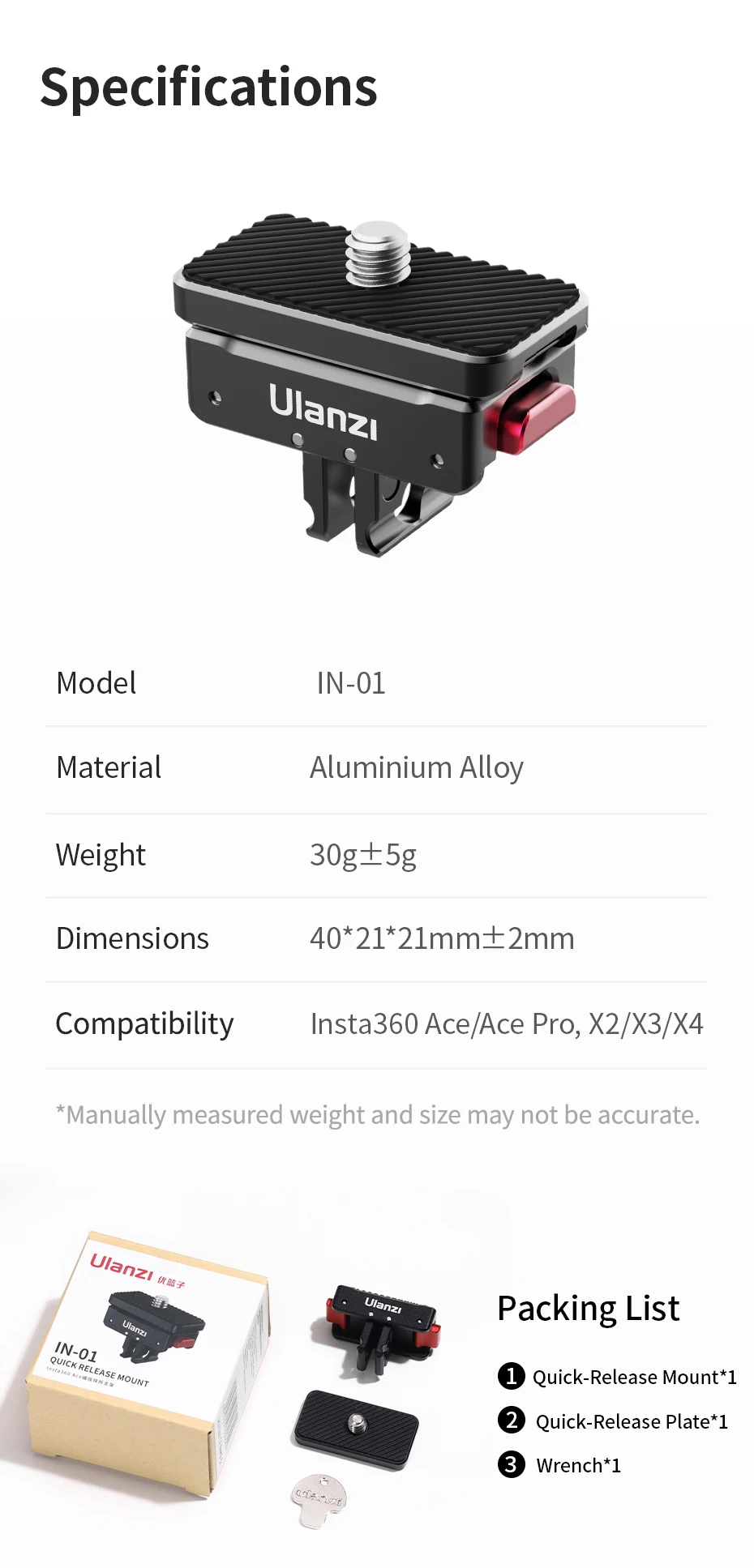 Monte y desmonte rápidamente su cámara de acción Insta360 de su cardán o trípode portátil con este soporte magnético de liberación rápida Ulanzi.Este dispositivo de liberación rápida multiusos, adaptable y magnético presenta un diseño ultrafino que lo hace invisible durante la captura de 360° tiros y un bloqueo de seguridad deslizante integrado evitan una liberación accidental del montaje.