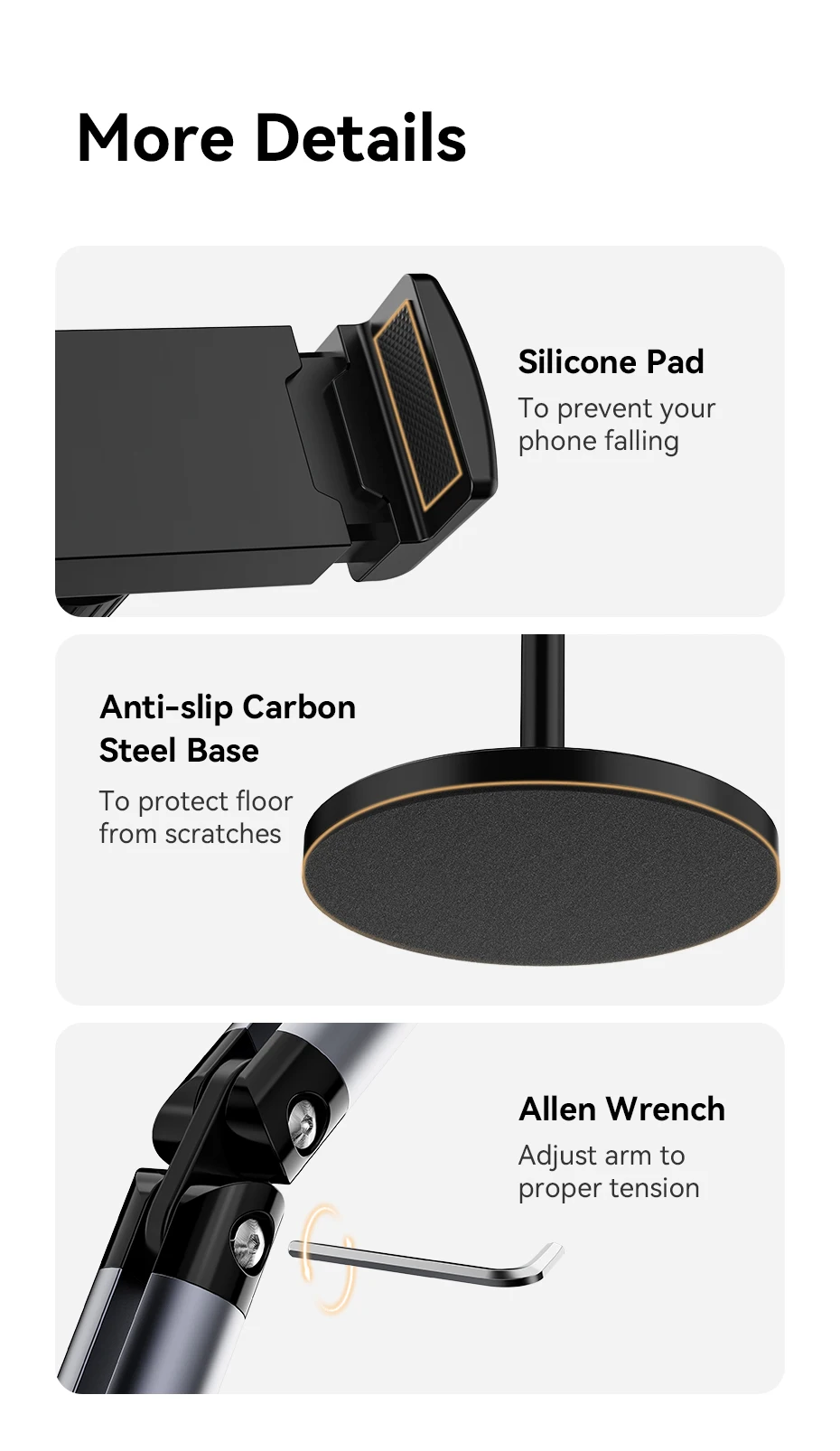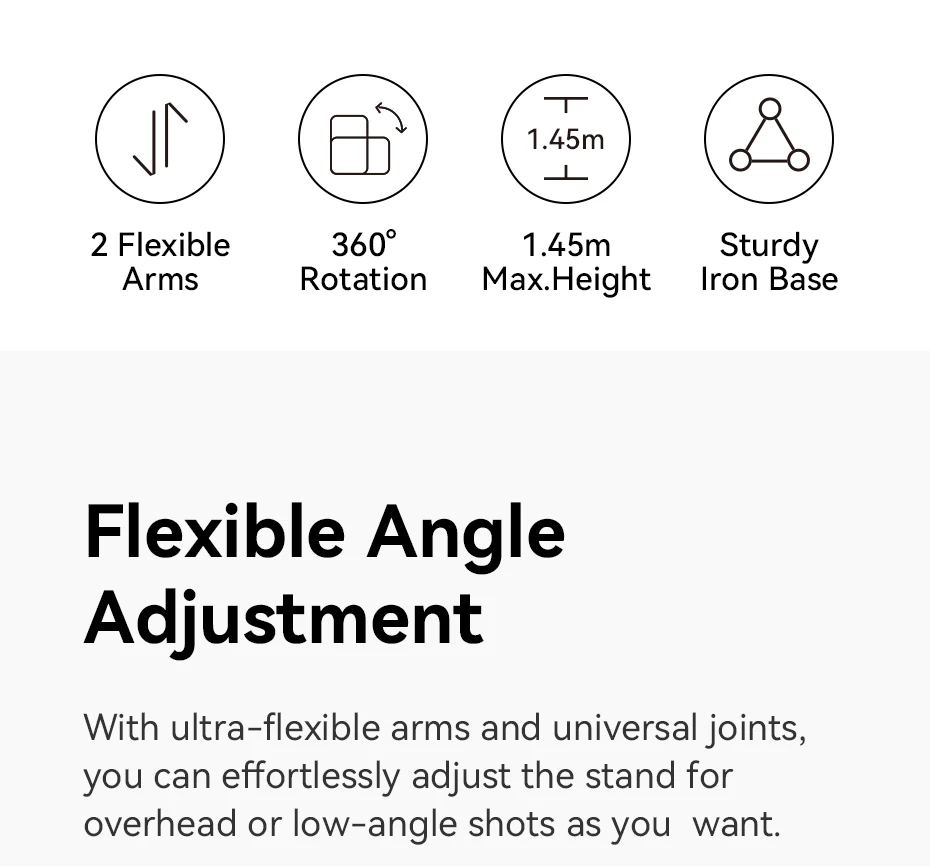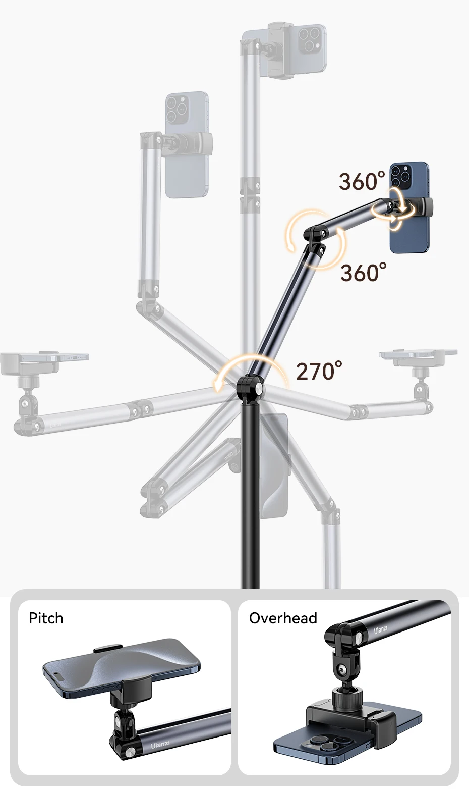 Con brazos ultraflexibles y juntas universales, puede ajustar sin esfuerzo el soporte para tomas aéreas o de ángulo bajo como desee.
