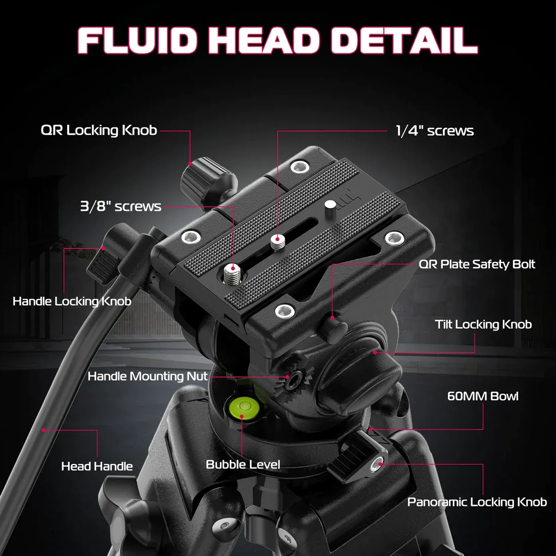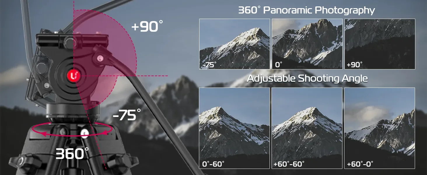Cabezal fluido para movimientos suaves: Equipado con un cabezal fluido que ofrece una panorámica de 360 ° y un movimiento de inclinación de-75 °/+ 90 °, junto con un sistema de equilibrio y control de amortiguación, este trípode permite una fácil captura de panorámicas, ángulo bajo, y tomas aéreas mientras se mantiene la estabilidad. Un mango extraíble garantiza una panorámica suave, mientras que los niveles de burbuja ayudan a mantener un horizonte nivelado.