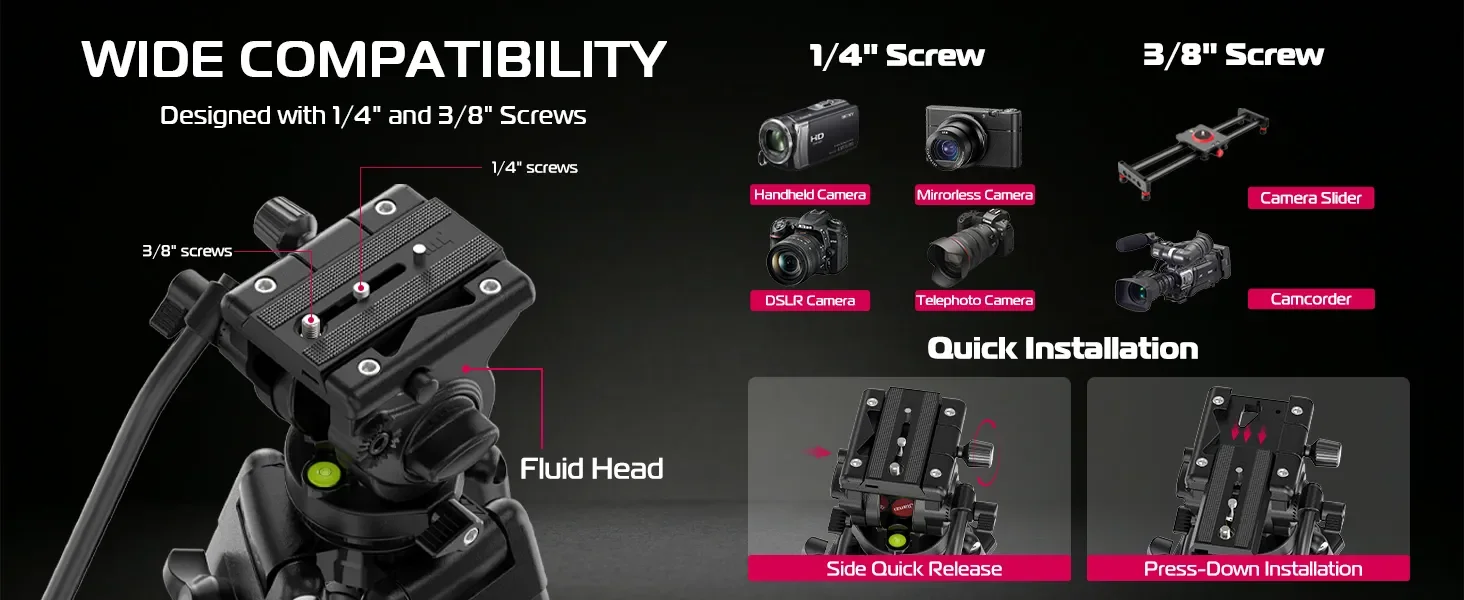 Instalación rápida de cámaras de seguridad: El cabezal fluido cuenta con un mecanismo de liberación rápida de presión lateral para una fijación y extracción rápida y segura de la cámara. Las placas de liberación rápida incluidas de 1/4 "-20 y 3/8"-16 tornillos (con llave incorporada) son compatibles con una amplia gama de DSLR, cámaras sin Espejo, videocámaras, cardanes, plataformas de vídeo y más.