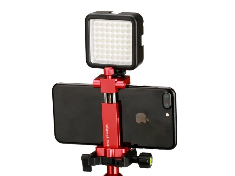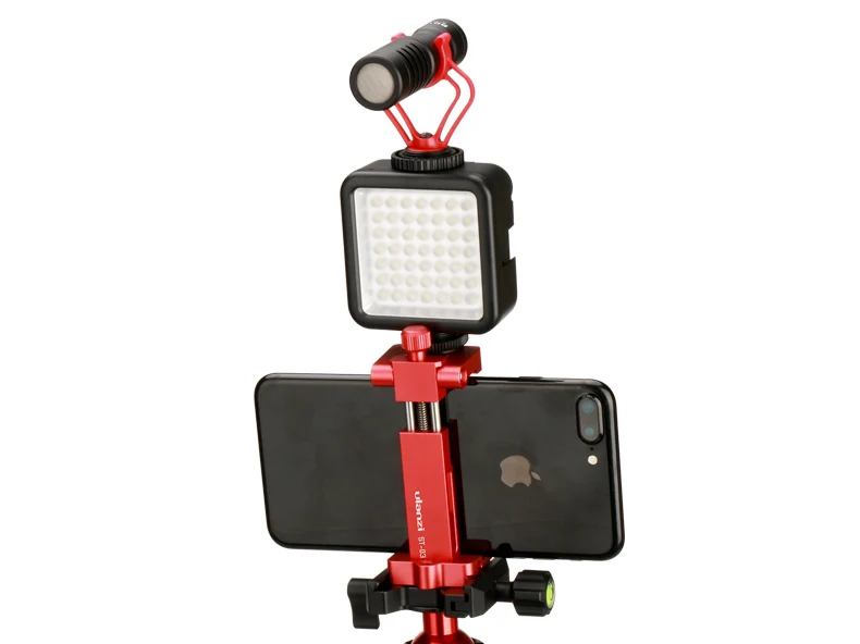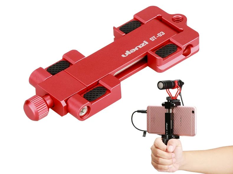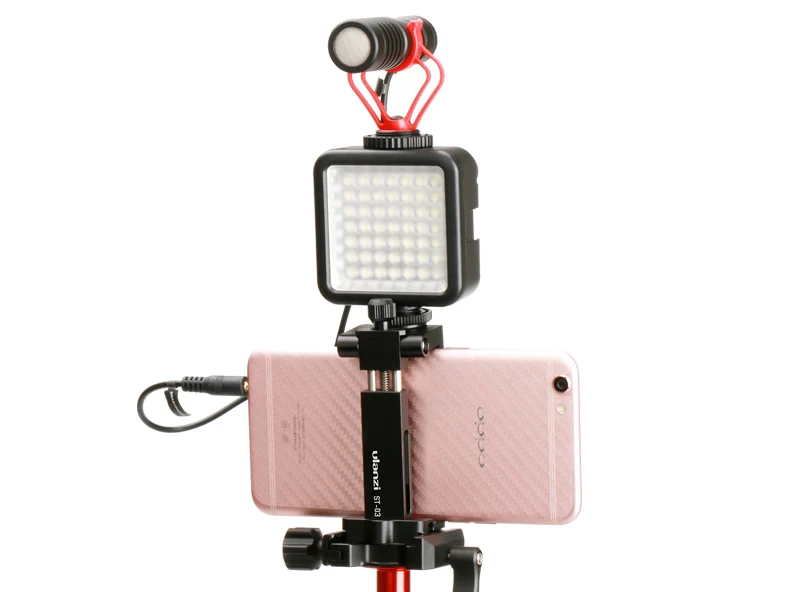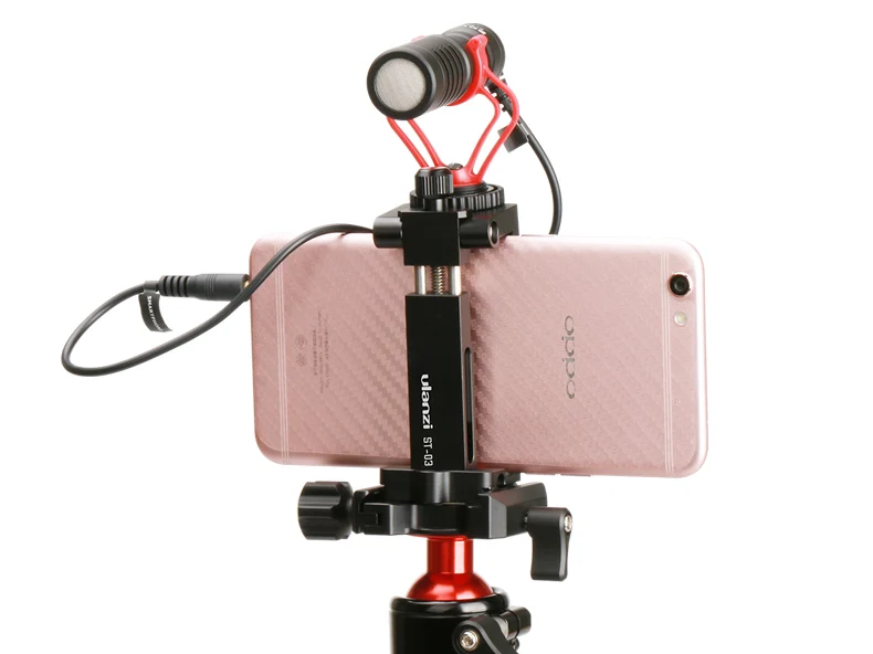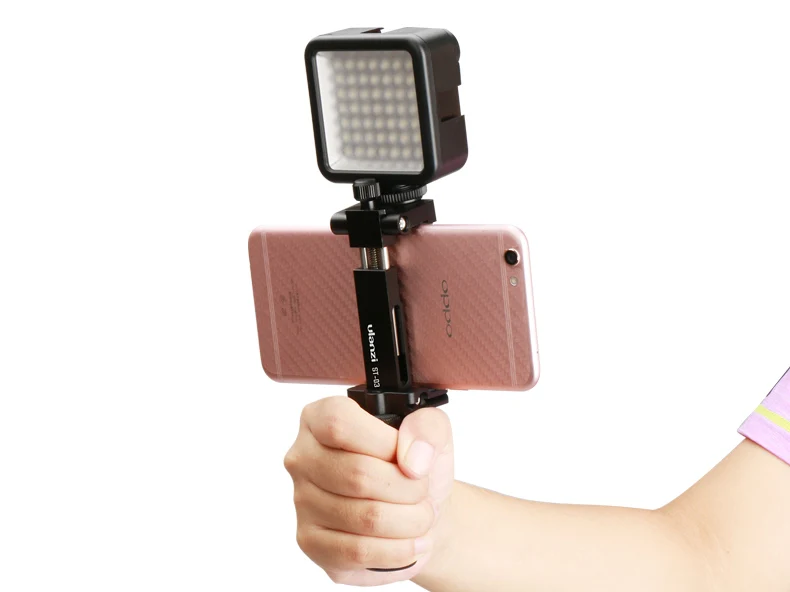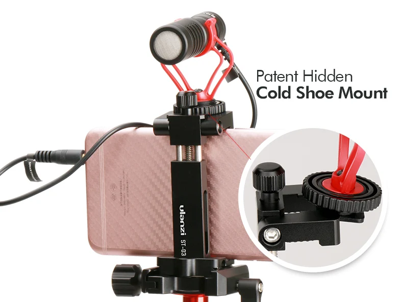 Soporte de zapata oculta---- Con un diseño patentado de montura de zapata fría oculta, puede montar el micrófono de video y la luz de video LED o una Gopro en la parte superior del soporte del teléfono.