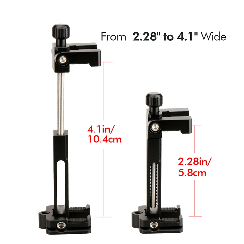 Universal----- Sostiene cualquier teléfono inteligente de 2,28 "a 4,1" de ancho.Compatible con teléfonos inteligentes de 4,3 pulgadas a 7 pulgadas... El soporte para teléfono móvil de la se puede conectar a cualquier trípode estándar (1/4-20), y puede asegurar su teléfono móvil para fotos, vídeos o para ser utilizado como cámara web o GPS de coche.