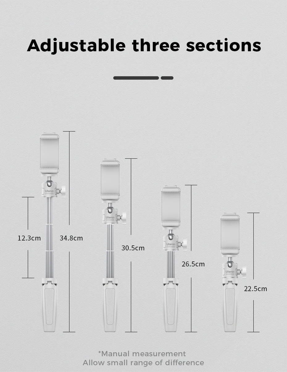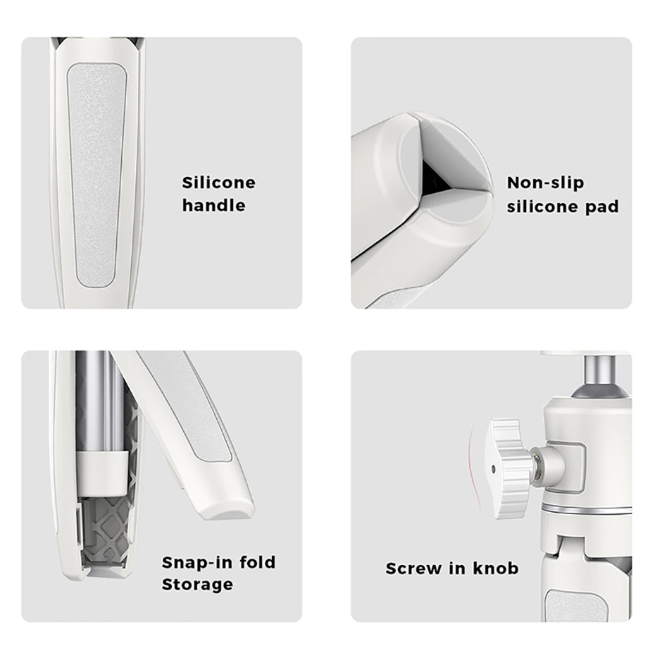 【Súper versátil】 --- Un accesorio muy versátil. Es una combinación de palo de selfie, poste de extensión y trípode todo en un paquete pequeño. La longitud máxima de extensión del poste es de 4,7 pulgadas.