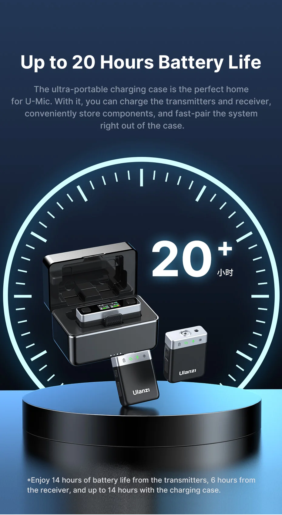 Hasta 20 horas de duración de la batería: El estuche de carga ultraportátil es el hogar perfecto para U-Mic.Con él, puede cargar los transmisores y el receptor, almacenar cómodamente los componentes y emparejar rápidamente el sistema desde el primer momento.