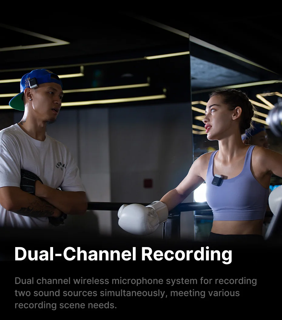 Grabación de doble canal: Sistema de micrófono de solapa inalámbrico de doble canal para grabar dos fuentes de sonido simultáneamente, satisfaciendo diversas necesidades de escenas de grabación.