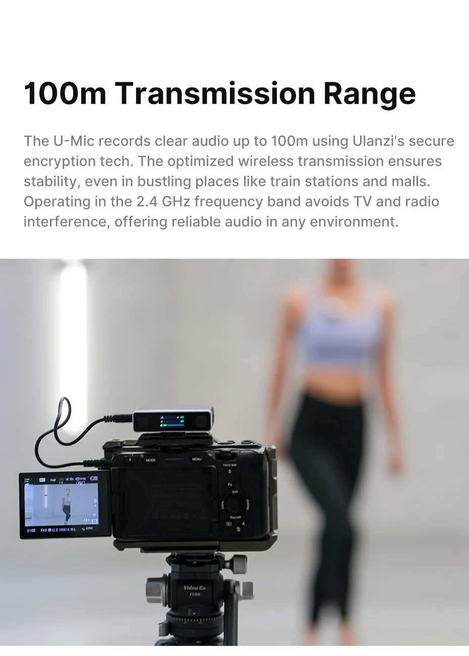 Rango de transmisión de 100 m: El AM18 graba audio claro hasta 100 m utilizando la tecnología de cifrado segura de Ulanzi.La transmisión inalámbrica optimizada garantiza la estabilidad, incluso en lugares llenos como estaciones de tren y centros comerciales.Operar en la banda de frecuencia de 2,4 GHz evita interferencias de TV y radio, ofreciendo un audio confiable en cualquier entorno.