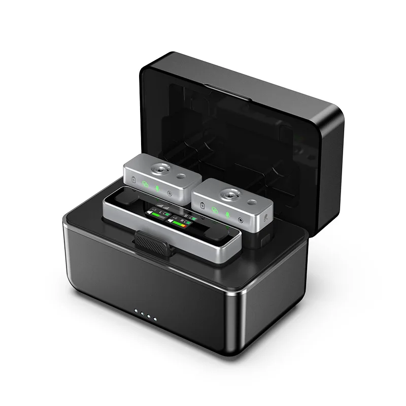 Hasta 20 horas de duración de la batería: El estuche de carga ultraportátil es el hogar perfecto para U-Mic.Con él, puede cargar los transmisores y el receptor, almacenar cómodamente los componentes y emparejar rápidamente el sistema desde el primer momento.