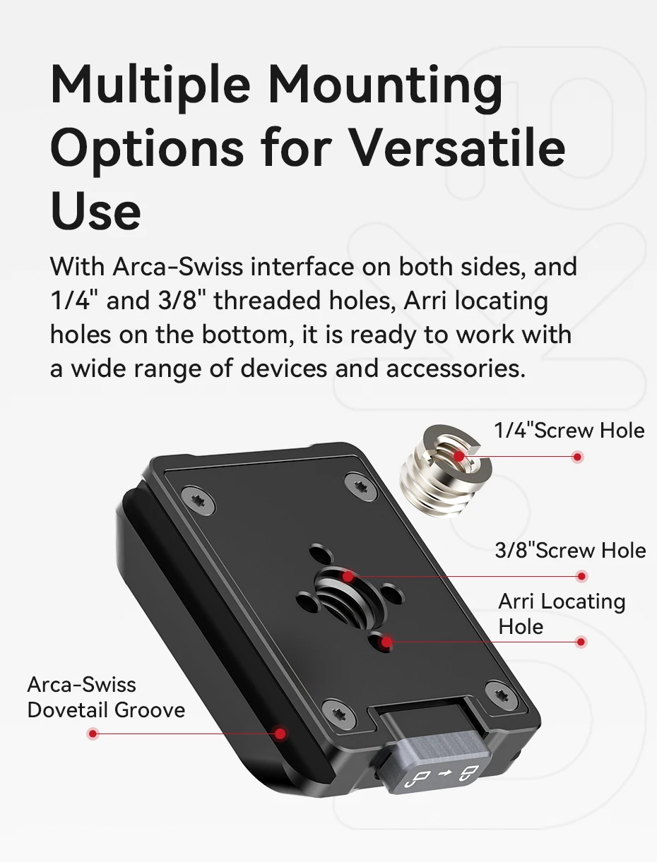 Con la interfaz Arca-Swiss en ambos lados y los orificios roscados de 1/4" y 3/8", los orificios de localización Arri en la parte inferior, está listo para funcionar con una amplia gama de dispositivos y accesorios.