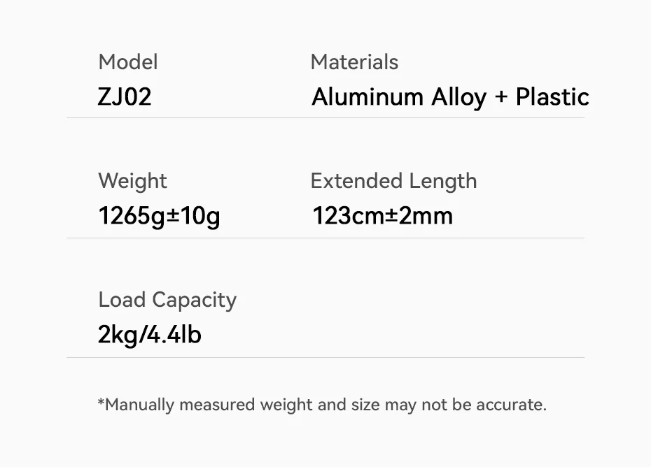 Longitud extendida: 123 cm ± 2 mm/48,43 pulgadas ± 0,08 pulgadas