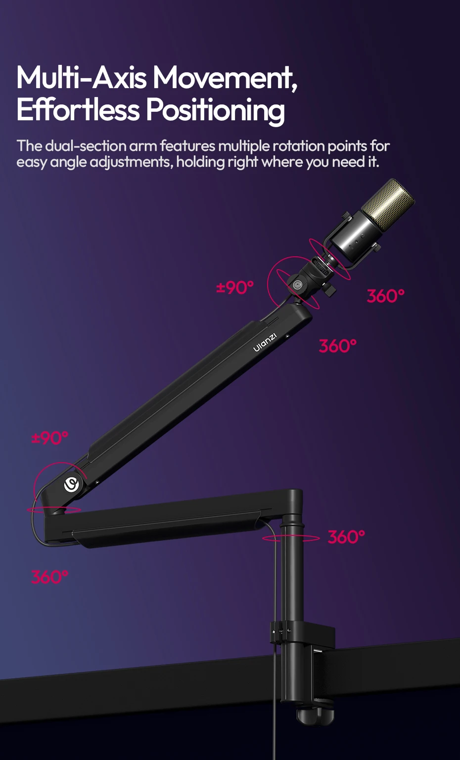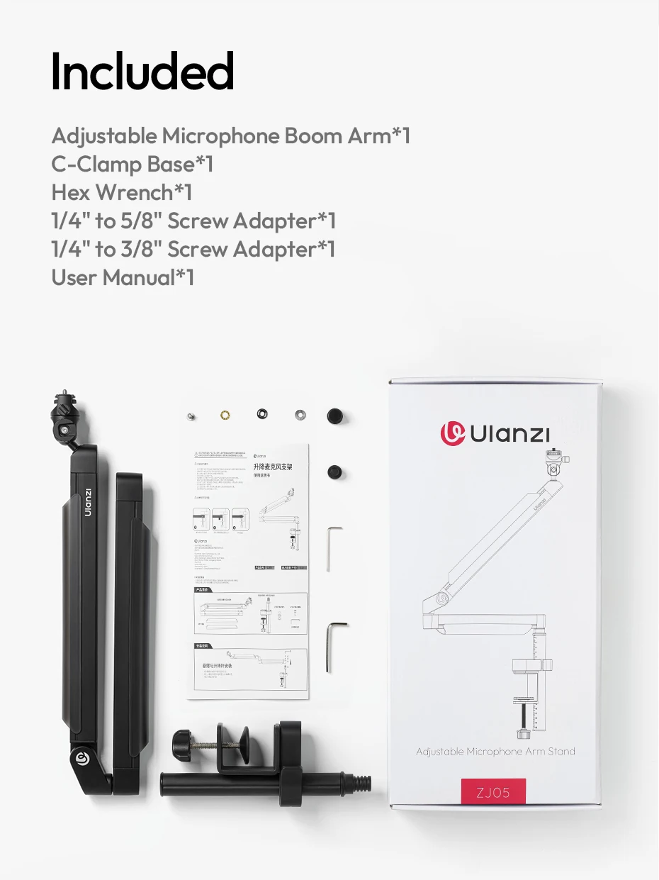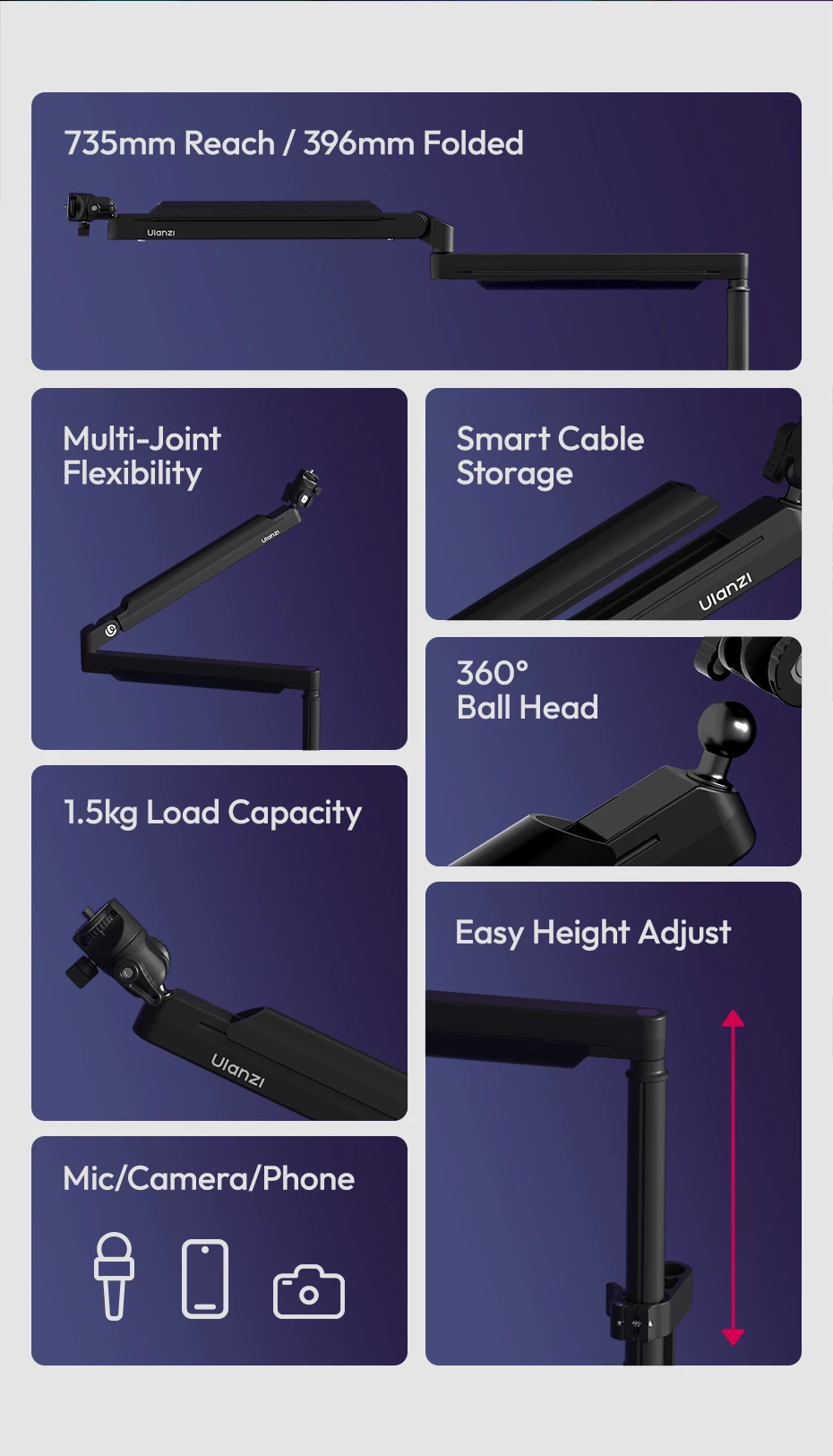 Ulanzi ZJ05 Brazo de brazo de micrófono ajustable con 360 ° Bola de carga de 1,5 kg para fotografía de Vlog en vivo con micrófono/cámara/teléfono