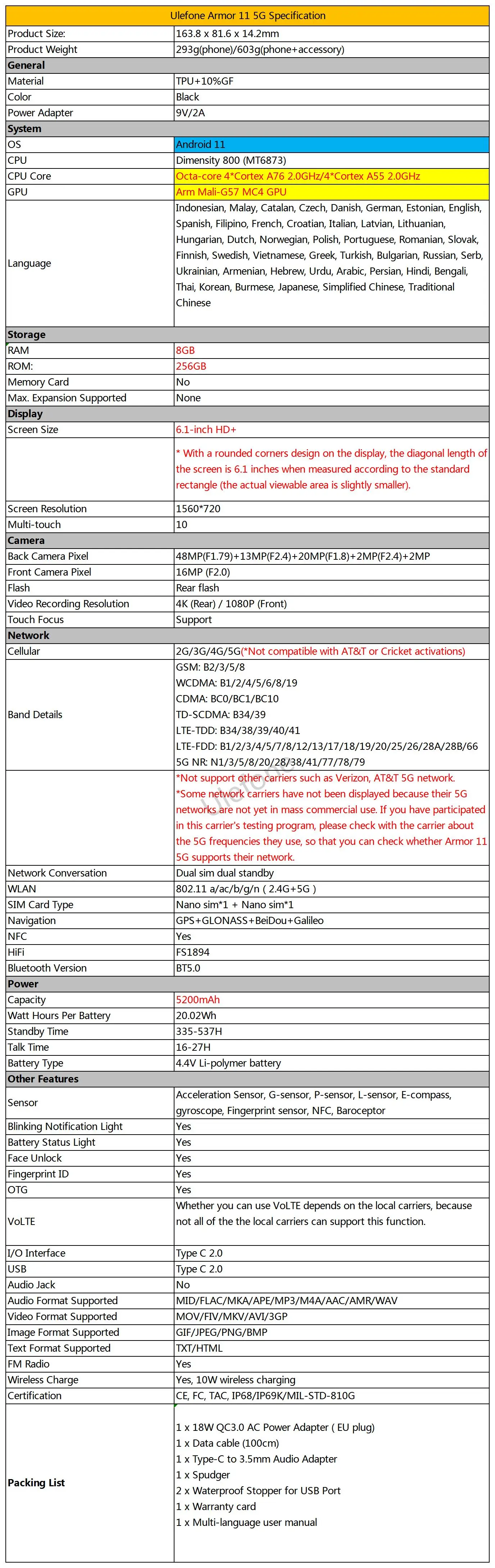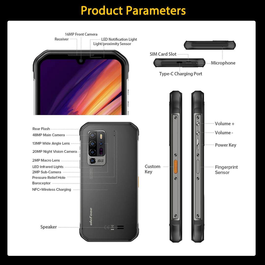 Adopte la velocidad ultrarrápida con un SoC 5G totalmente integrado, chipset MediaTek Dimensity 800 5G.Gracias a la tecnología de proceso insignia de 7 nm y a las potentes arquitecturas de CPU, Ulefone Armor 11 5G puede lograr un alto rendimiento, bajo consumo de energía y fluidez del sistema.Con una GPU Arm Mali-G57 MC4 premium con MediaTek HyperEngine 2.0, le brindará la mejor experiencia de juego y calidad de imagen.