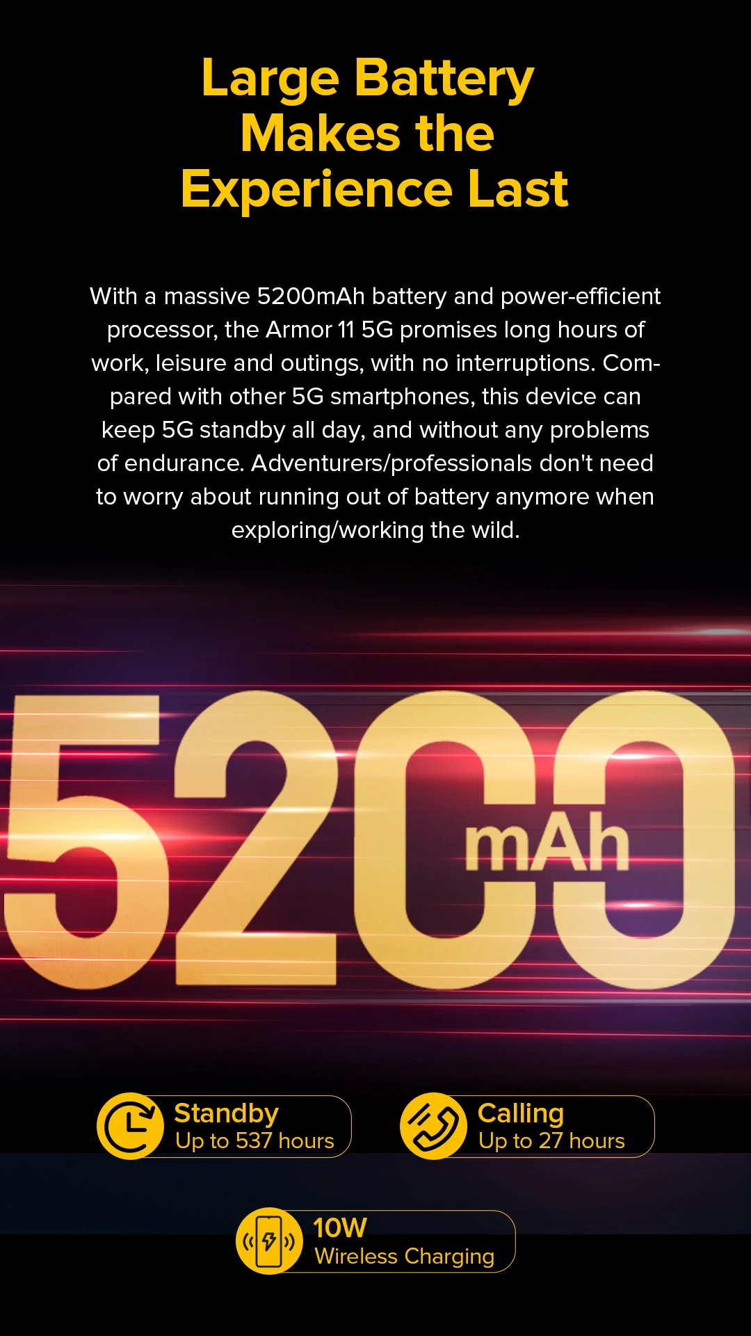 Con una enorme batería de 5200 mAh y un procesador de bajo consumo, Armor 11 5G promete largas horas de trabajo, ocio y salidas, sin interrupciones.En comparación con otros teléfonos inteligentes 5G, este dispositivo puede mantener el modo de espera 5G durante todo el día y sin problemas de resistencia.Los aventureros/profesionales ya no necesitan preocuparse por quedarse sin batería al explorar/trabajar en la naturaleza.