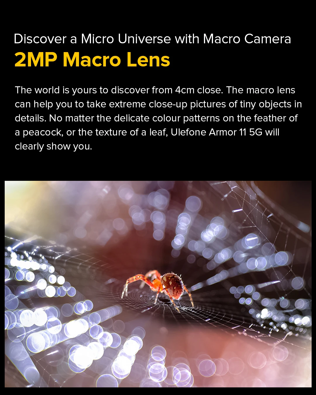 El mundo es tuyo descubrir desde 4 cm de cerca.La lente macro puede ayudarle a tomar fotografías extremas de objetos pequeños en detalle.No importa los delicados patrones de colores en la pluma de un pavo real o la textura de una hoja, Ulefone Armor 11 5G te mostrará claramente.